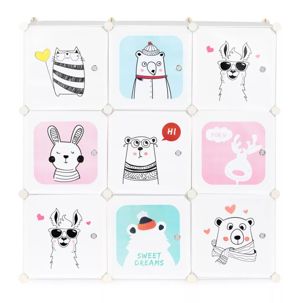 Egy könyvespolcot mutatunk be a gyerekeknek, tökéletes a szeretett játékok, könyvek és apróságok tárolására. Ez a moduláris szekrény 9 polcból (modulokból) amelyek szabadon elrendezhetőka bútoroknak a egyéni igényekhez és preferenciákhoz való igazítása érdekében.