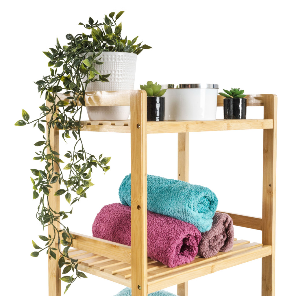 A három polcos bambusz polcállvány kellemes, természetes hangulatot kölcsönöz a belső térnek, könnyedség és természetesség érzetét, ereje és hosszú élettartama pedig stabilitást és tartósságot biztosít.