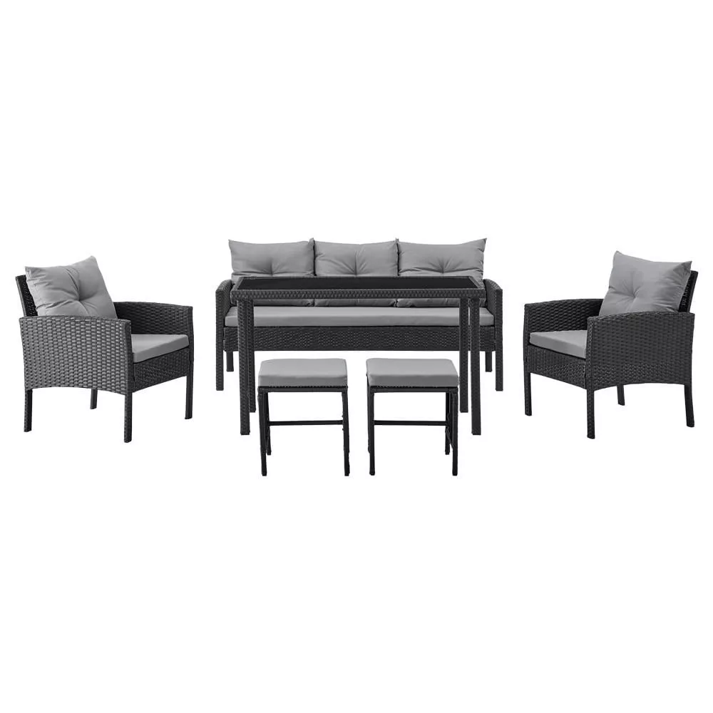 A hangulatos kerti bútor 7 fő részére készült, kényelmet biztosítva étkezés közben és a szabadban való pihenéshez. A garnitúra tartalmaz egy széles, 3 személyes kanapét, amely a központi eleme, valamint két fotelt és két puffot, amelyek lehetővé teszik a vendégek kényelmes ülését. Az egész funkcionális és kényelmes teret teremt a pihenéshez és a közös étkezésekhez.