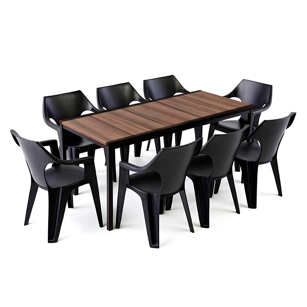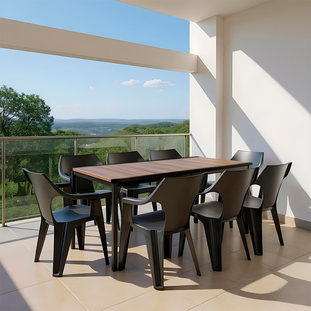 Egyetlen, nagyméretű szettben kapsz meg mindent, ami a hétvégi, ráérős reggelitől a baráti grillpartiig kell: hat Dante kartámaszos szék modern lekerekített háttámlával + egy 200 × 95 cm-es Porto étkezőasztal – prémium műanyagból, kompromisszumok nélküli kényelemmel és nulla karbantartással.