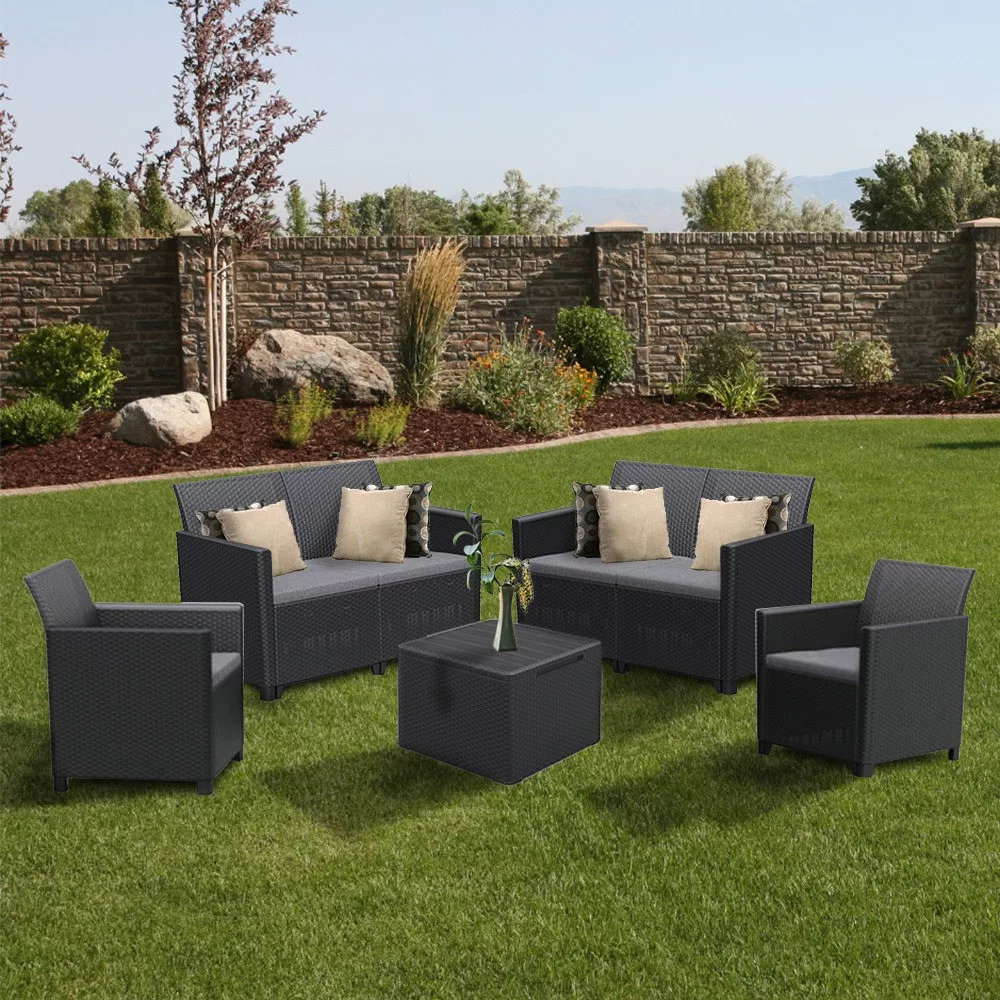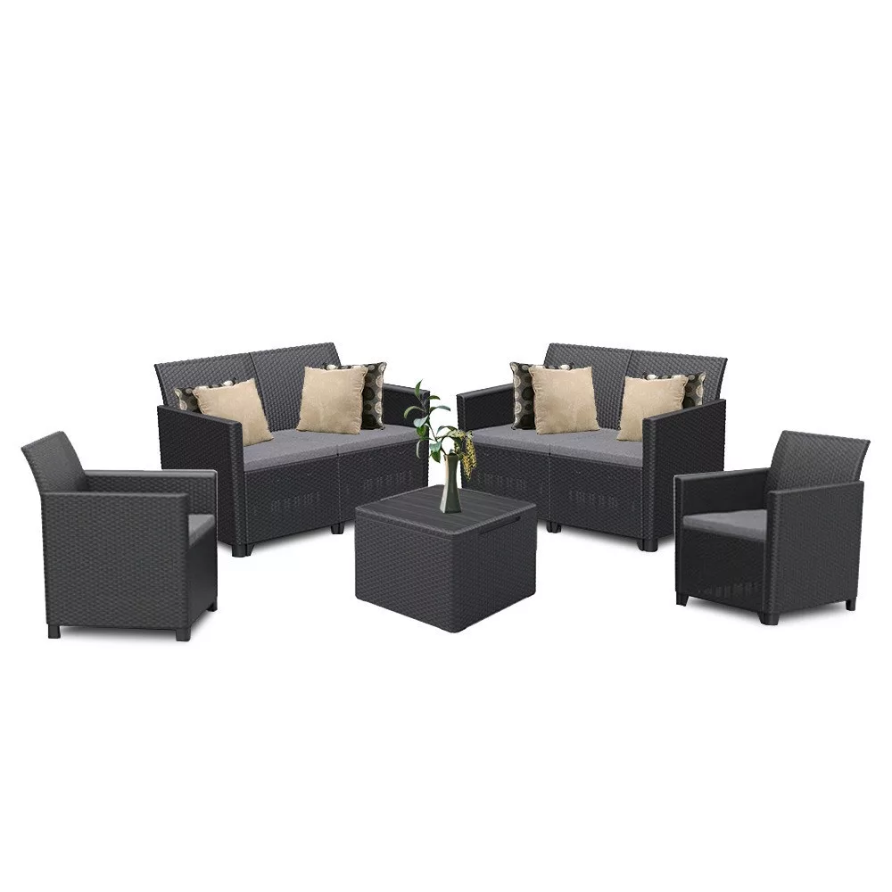 Ez egy rattan stílusra emlékeztető elegáns bútor szett két fotellel, kettő két személyes kanapéval és egy párnatartós asztallal. Ez a bútor szett kellemessé teszi a kertben vagy a teraszon töltött nyári napokat. A könnyű és egyúttal stabil szerkezetű bútorok tisztítása nagyon egyszerű. A szett ellenálló a sérülésekkel és az időjárás hosszan tartó viszontagságaival, illetve az UV sugárzással szemben is.