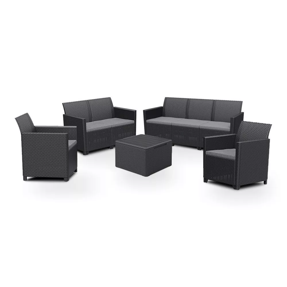 Ez egy rattan stílusra emlékeztető elegáns bútor szett két fotellel, egy két személyes kanapéval, egy három személyes kanapéval és egy párnatartós asztallal. Ez a bútor szett kellemessé teszi a kertben vagy a teraszon töltött nyári napokat. A könnyű és egyúttal stabil szerkezetű bútorok tisztítása nagyon egyszerű. A szett ellenálló a sérülésekkel és az időjárás hosszan tartó viszontagságaival, illetve az UV sugárzással szemben is.