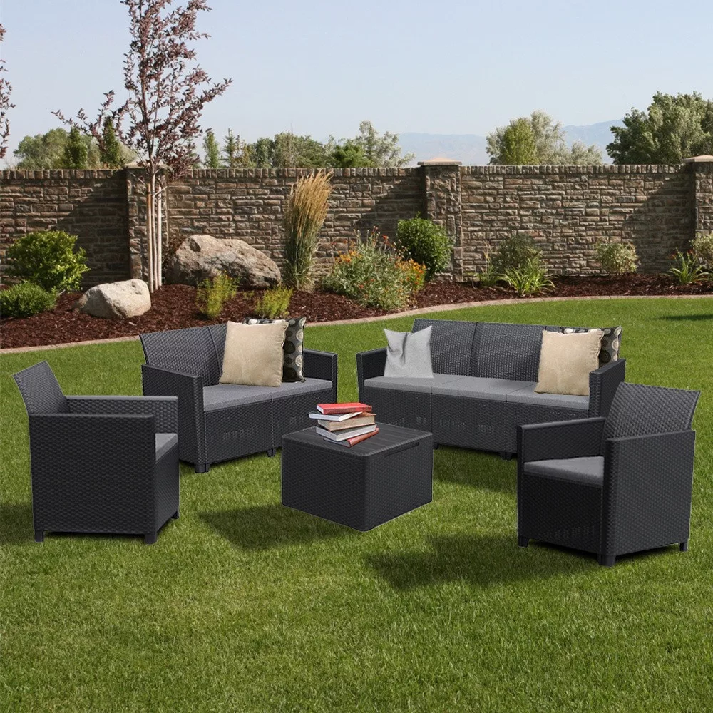 A grafit színű rattan kerti bútor szett két darab 65x 63 x 74 cm-es fotelből, egy 65x 113x 74 cm-es két személyes kanapéból, egy 65x 163x 74 cm-es három személyes kanapéból, melyeknek ülőmagassága párna nélkül 35 cm, ülőmagassága párnával pedig 40 cm, és egy 55,5x 55,5x 38 cm-es párnatartós asztalból áll. Ez egy kiváló minőségű termék, amely a legjobb minőségű fröccsöntött műanyagból készült.
