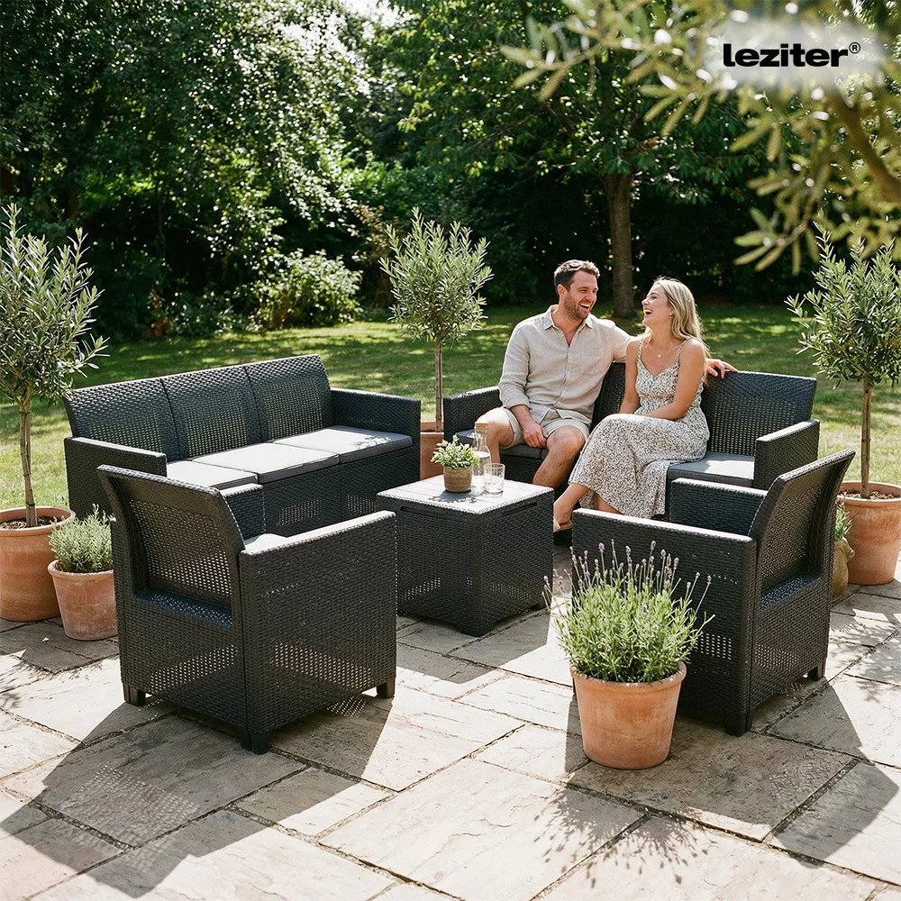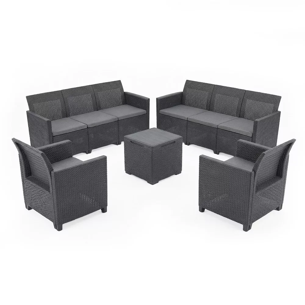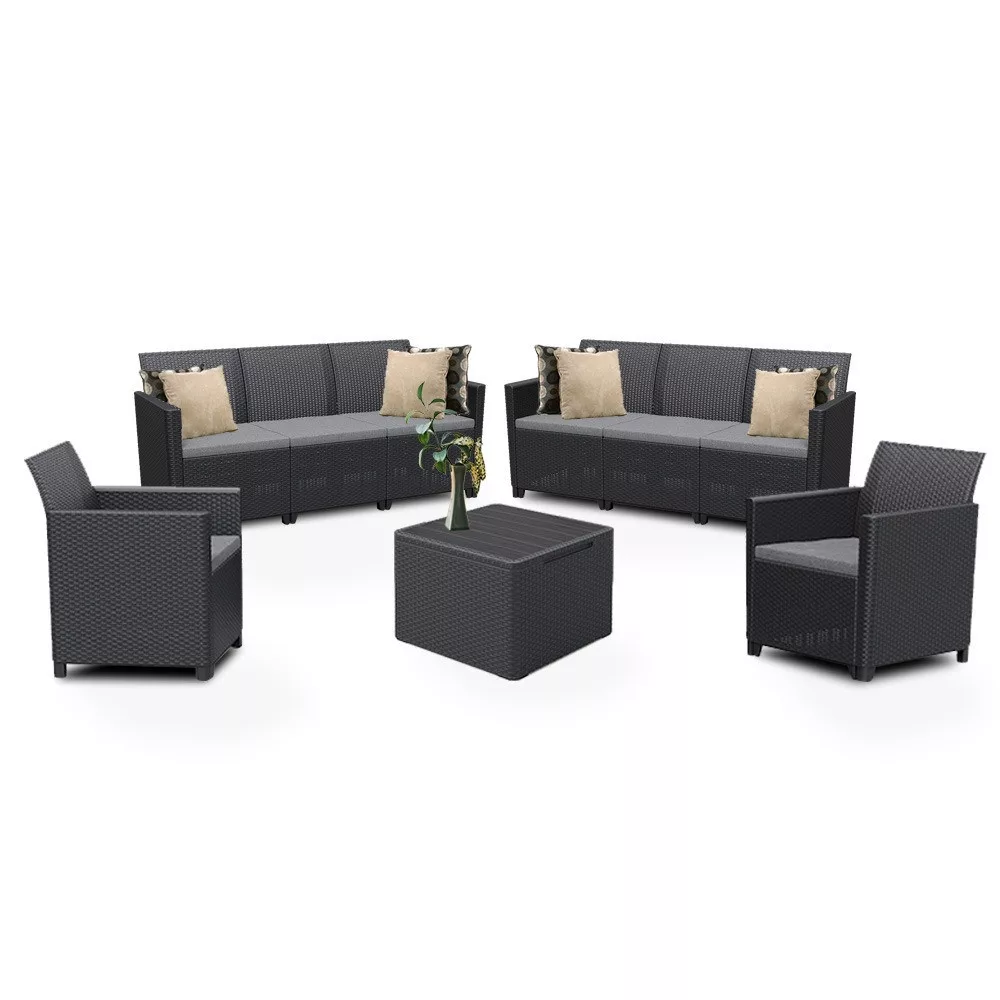 Ez egy rattan stílusra emlékeztető elegáns bútor szett két fotellel, két három személyes kanapéval és egy párnatartós asztallal. Ez a bútor szett kellemessé teszi a kertben vagy a teraszon töltött nyári napokat. A könnyű és egyúttal stabil szerkezetű bútorok tisztítása nagyon egyszerű. A szett ellenálló a sérülésekkel és az időjárás hosszan tartó viszontagságaival, illetve az UV sugárzással szemben is.