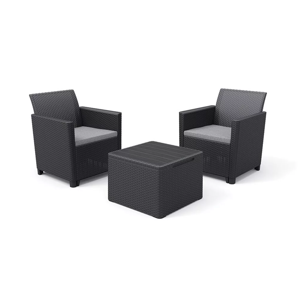 A grafit színű rattan kerti bútor szett két darab 65x 63 x 74 cm-es fotelből és egy 55,5x 55,5x 38 cm-es párnatartós asztalból áll. Ez egy kiváló minőségű termék, amely a legjobb minőségű fröccsöntött műanyagból készült.