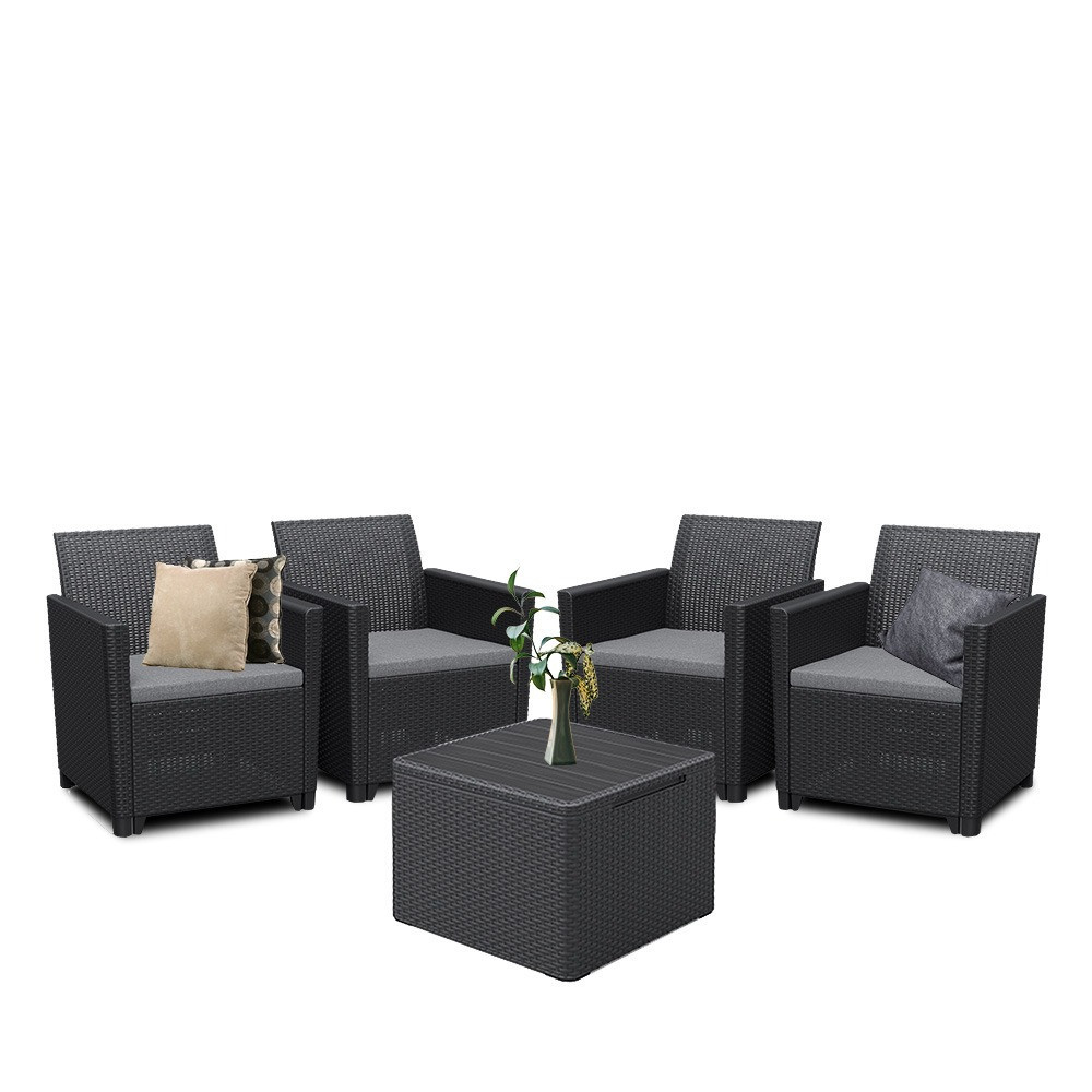 A grafit színben kapható kerti bútor szett könnyű, egyben tartós vázszerkezettel büszkélkedik. Mindennek tetejében roppantul könnyen tisztítható minden egyes eleme, így pillanatok alatt makulátlanná varázsolható az összkép. A grafit árnyalatban elérhető szetthez szürke párnák társulnak, melyek a maximális kényelmet hivatottak borítékolni, a divatos és szemre való megjelenés mellett. A bútorok erős és tartós műanyagból készültek. Az erős, tartós kialakítás nagyfokú megbízhatóságot jelent a gyakorlatban és azt, hogy a bútordarabok kivétel nélkül hosszú élettartamot biztosítanak, az örömteli, nyári napokat fűszerező használaton kívül, ami a fenti pozitívumoknak hála alap.