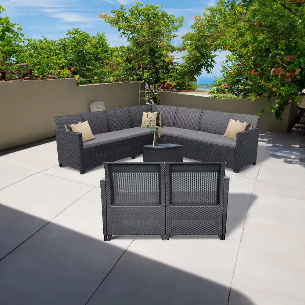 Ez a Grafit színű rattan hatású kerti bútor szett két fotellel, egy 9 személyes sarokkanapéval, egy 2 személyes kanapéval és egy tárolós asztallal rendelkezik, amelyeket időjárásálló műanyagból készítettek, így nem kell aggódnod a UV sugárzás hatásaitól sem. A kanapé magassága: 74 cm, szélessége: 113 cm, hossza: 65 cm. A kanapé párnával rendelkezik, mely kényelmessé teszi és színben passzol a bútorhoz. Az asztal magassága: 37 cm, szélessége: 37 cm, hossza: 37. Az asztal több funkciós, így a tároló részében elrejtheted a kerti eszközöket.