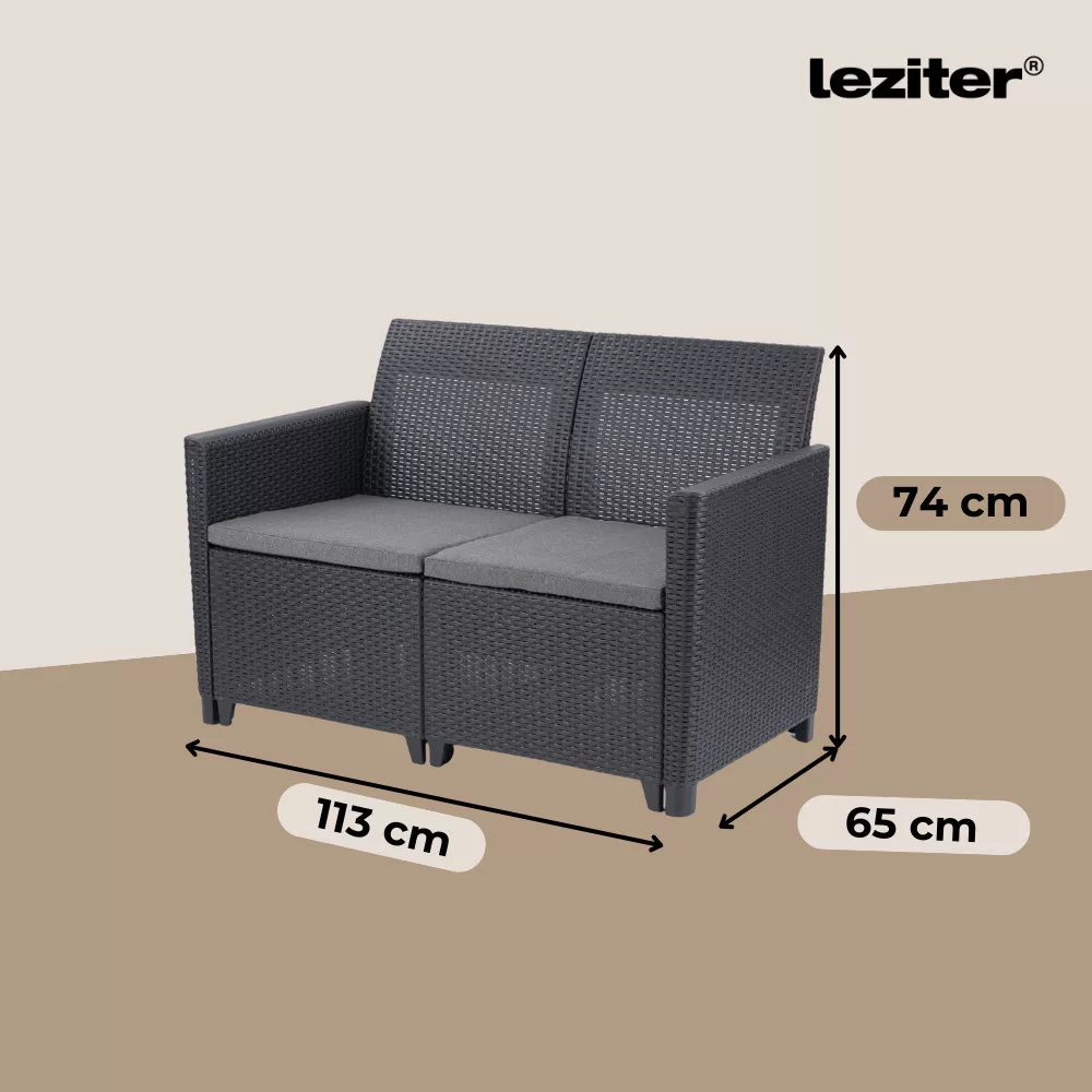 A garnitúra kiváló minőségű, időjárásálló anyagokból készült, amelyek ellenállnak az UV-sugárzásnak, esőnek és szennyeződéseknek. Karbantartást gyakorlatilag nem igényel – csak élvezni kell.