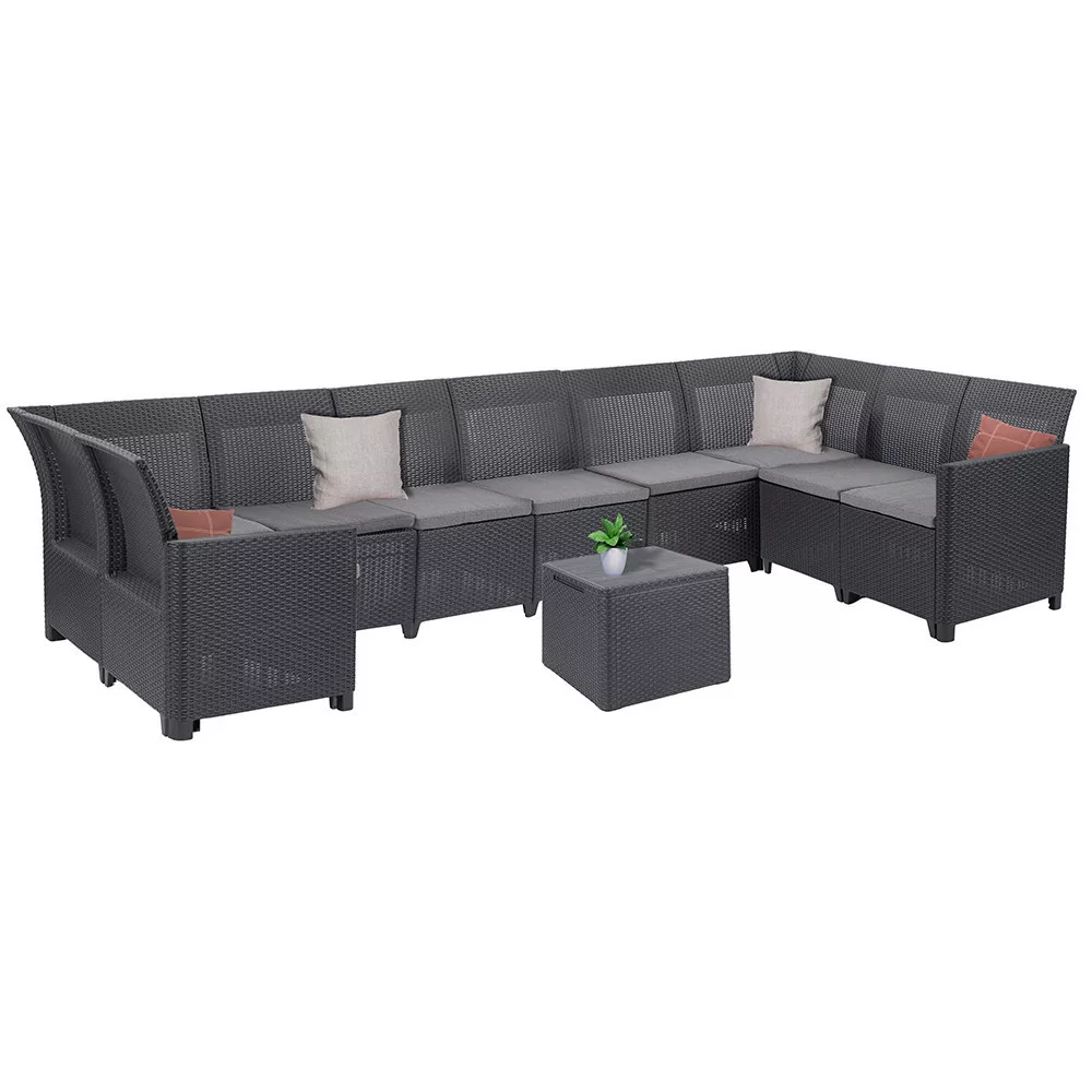 A CLAIRE VIII 9 személyes sarokgarnitúra ideális választás, ha ki szeretnéd használni teraszod vagy kerted minden szegletét. Ez a prémium minőségű bútorszett egyesíti a funkcionalitást és a modern designt, lehetővé téve, hogy a család és barátok kényelmesen élvezhessék a közös időtöltést a szabadban.
