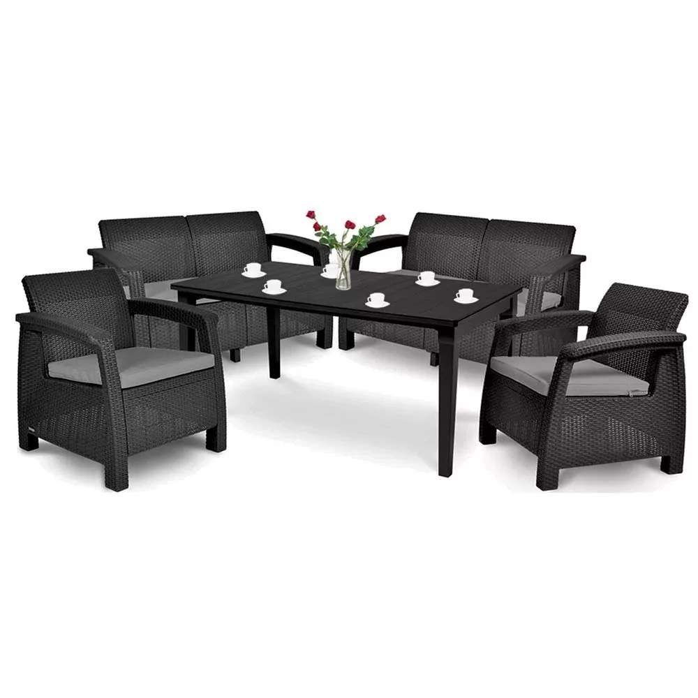 Elegancia és magas minőség jellemzi a Corfu Love Duo kerti bútor garnitúrát. Két komfortos fotelből, kettá kanapéból és egy asztalból áll. A Corfu Love Duo kerti bútor garnitúra tökéletesen passzol bármilyen környezetbe. Ennek köszönhetően szabadon engedheti a fantáziáját és a berendezés csak önön műlik.
