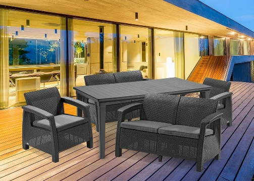 A Corfu Love duo kerti bútor garnitúra ideális elemként szolgál a kert, erkély vagy terasz díszítéséhez. Egyszerű formája és minimalista megjelenése teszi univerzálissá és bármilyen elrendezéshez alkalmazkodik. Praktikus és olcsó megoldás, mellesleg egész évben a szabadban állhat. Maga a garnitúra azt a benyomást kelti, hogy fából készült, de valójában egy remek minőségű müanyagból lett létrehozva.