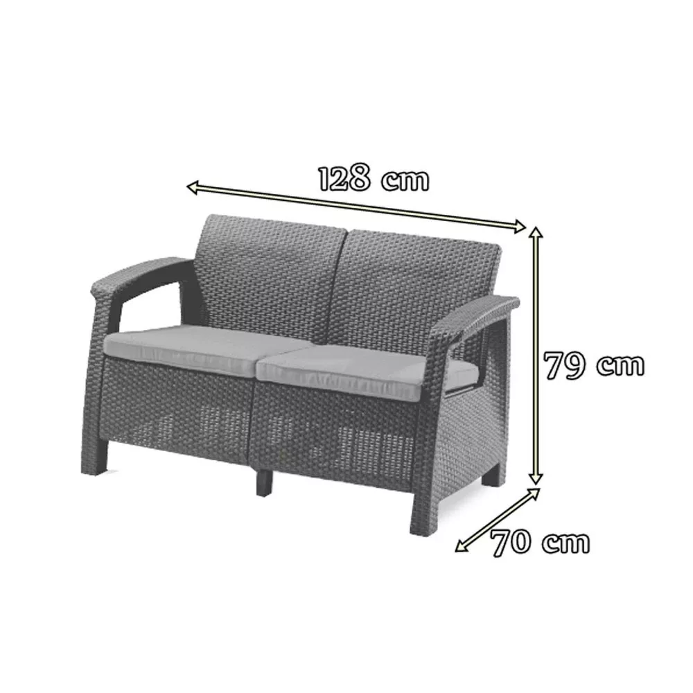 A stílusos Corfu Fiesta III szabadidő bútor szett maximális kényelmet garantál a felhasználók számára. A szettet modern dizájn jellemez, melyet természetes rattan fonás inspirált. A szett stabilitását és kényelmét szolid felépítésének és átgondolt szerkezetének köszönheti. A bútor szett két egyszemélyes fotelt, két kétszemélyes kanaépt és egy asztalt tartalmaz. A Corfu termékvonal - kényelmes párnákkal kapható. A bútorok ellenállnak az időjárás viszontagságainak és az UV sugárzásnak.A bútorokat a Curver gyártja, kiknek termékei megtalálhatóak még Keter márkanév alatt is. A Corfu egy kiváló minőségű európai termék, amely a legjobb minőségű fröccsöntött műanyagból készült.