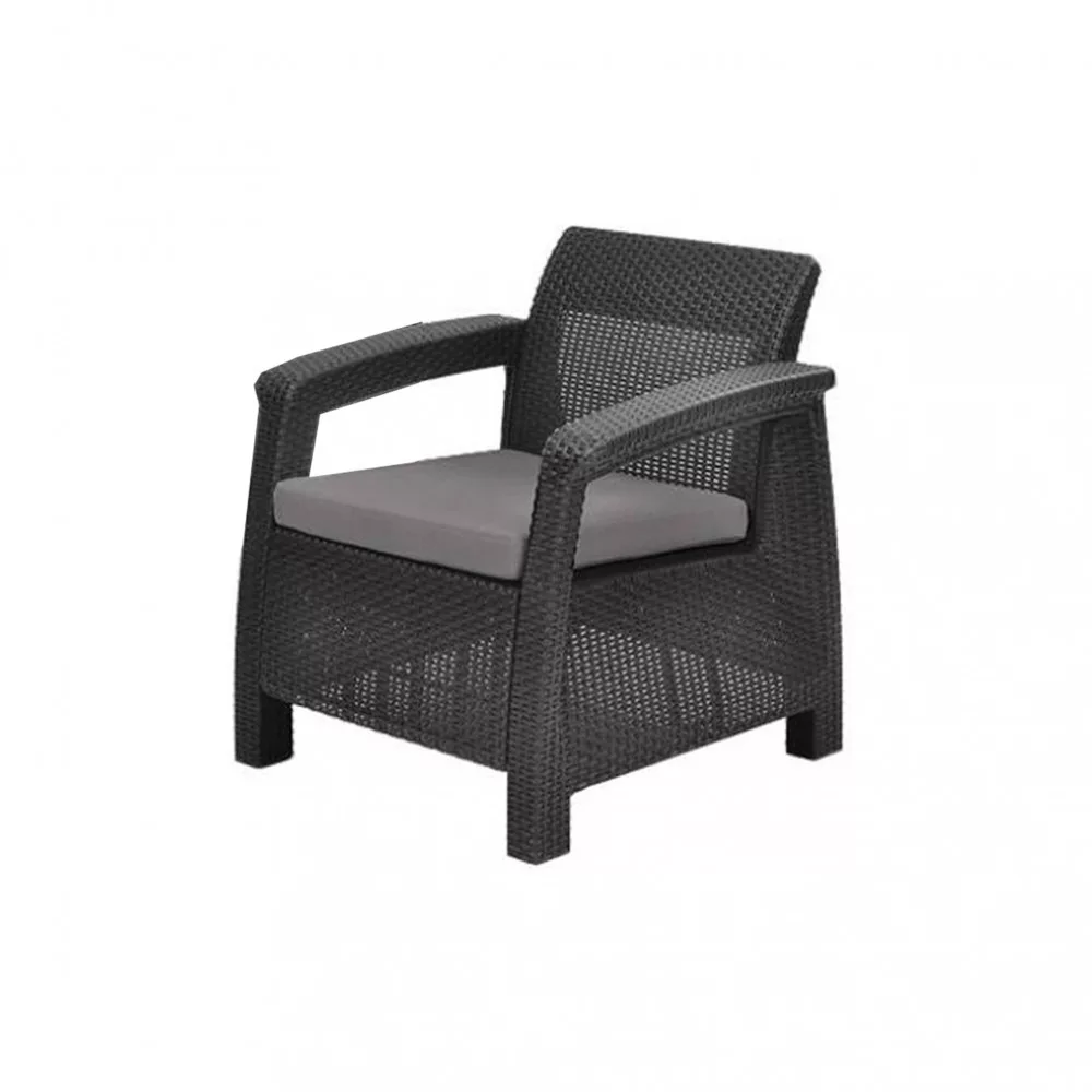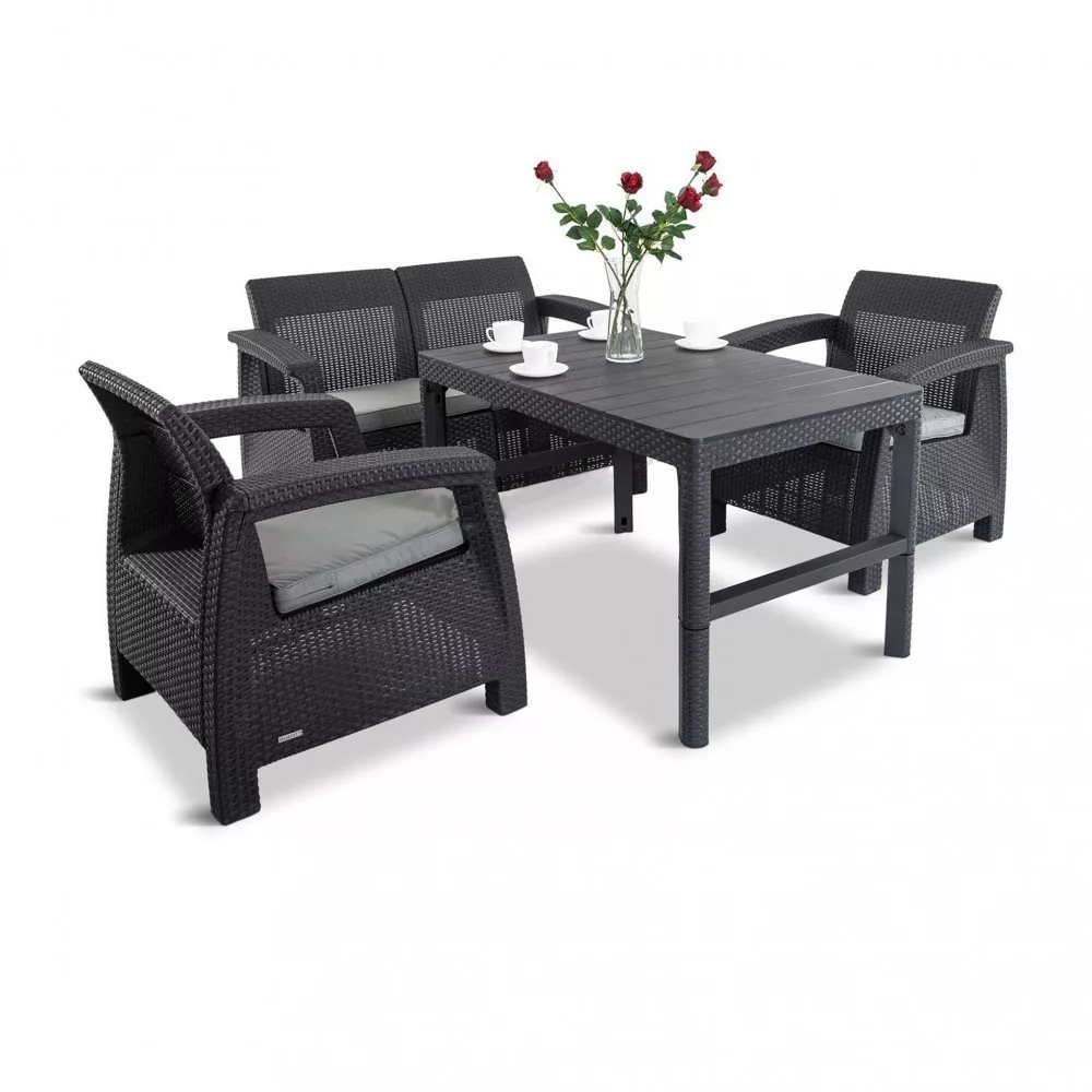 A Corfu Lyon Duo grafit színű kerti bútorkészlete bármilyen elrendezésben nagyszerűen mutat. Egy dupla kanapéból, két fotelből, öt lapos párnából és egy dohányzóasztalból áll. A készlet nemcsak a kertbe illeszkedik, hanem a teraszra is helyezhető az étterem és kávézó mellett. A korfu bútorok külső és belső használatra egyaránt alkalmasak. Visszafogott, grafit színekkel és univerzális formájúak, és kialakításuk a globális trendekre utal. A kerti szett egy emelt Corfu Lyon Duo asztallal nagyszerű kényelmet nyújt használatra.