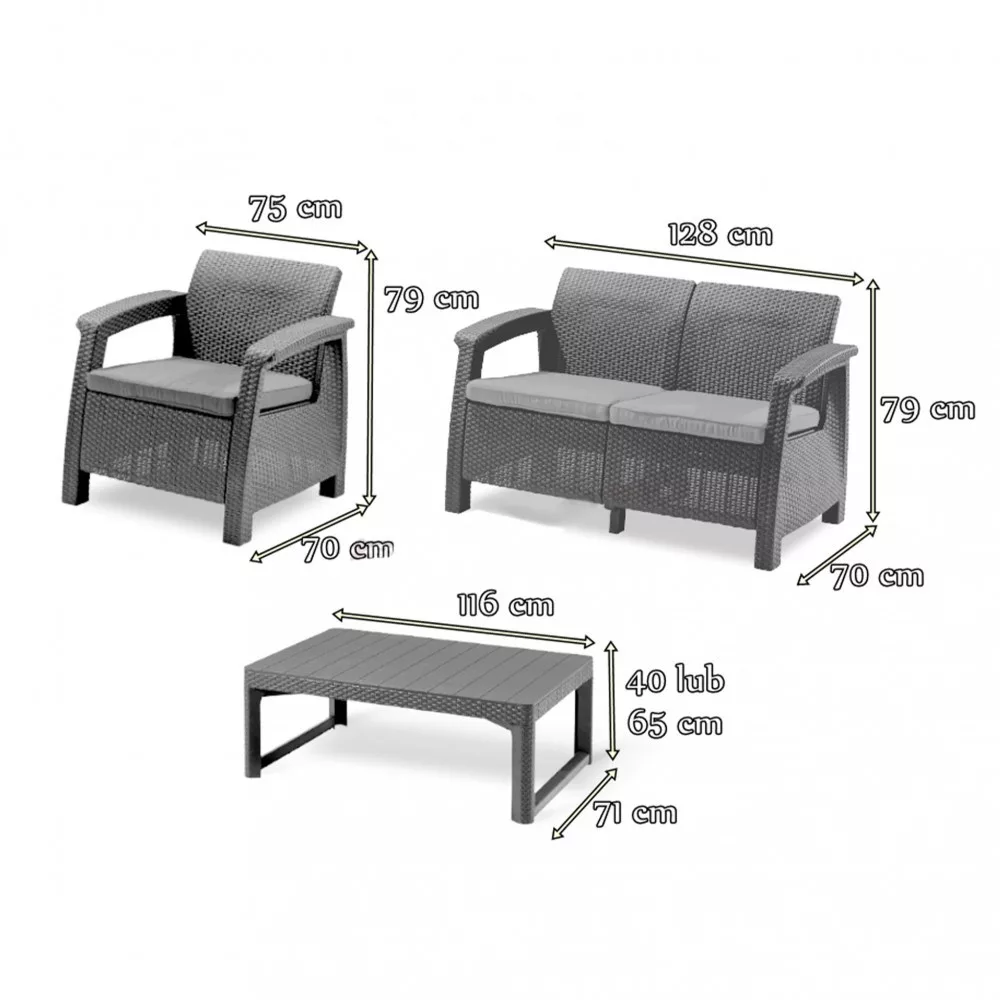A Corfu Lyon Duo bútorokat egy magyar Curver gyárban gyártják A Corfu Lyon Duo bútorok rendkívül kényelmesek. Különösen profilos háttámlákkal rendelkeznek, hogy a lehető legjobban támogassák a háttámlát. A készlet lapos, kényelmes, kb. 6 cm vastag párnákkal is szállítható. A széles kartámaszok jó támogatást nyújtanak, a kis lábak pedig egyenetlen talajon is megfelelő stabilitást nyújtanak.