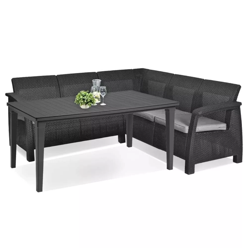 A modern Corfu Relax kerti bútor garnitúr ötvözi az eleganciát, a tökéletességet. A finom, letisztult árnyalatai nagyon népszerűek mind a belső terekben, mind a kertekben - ez egy kellemes kombináció, amely jól illeszkedik a környezethez, függetlenül a használt színektől. A mellékelt bútorokat polyrattan-szerű mintázat borítja. A kis lábak nemcsak a bútorok megfelelő stabilitásának garanciáját jelentik, hanem az elegáns kivitelét is.