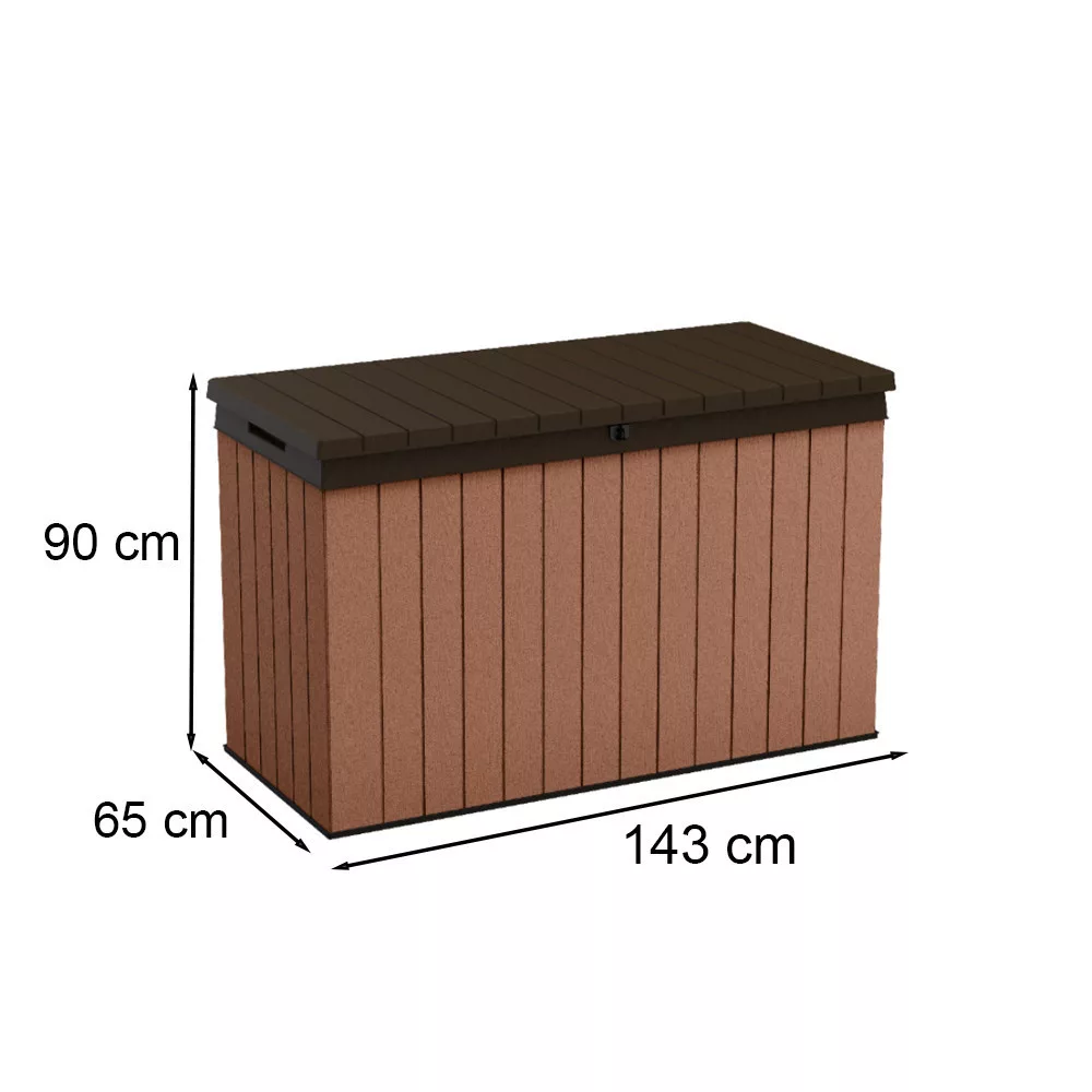 Kiváló megoldást jelent a Darwin 662L nagy űrtaltarmú kerti tárolódoboz a kerti eszközök, párnák és sportfelszerelések elrejtésére a kertben vagy a teraszon. A tárolódoboz méretei – 143 cm szélesség, 65 cm mélység és 90 cm magasság – elegendő helyet biztosítanak a kerti kellékek számára.