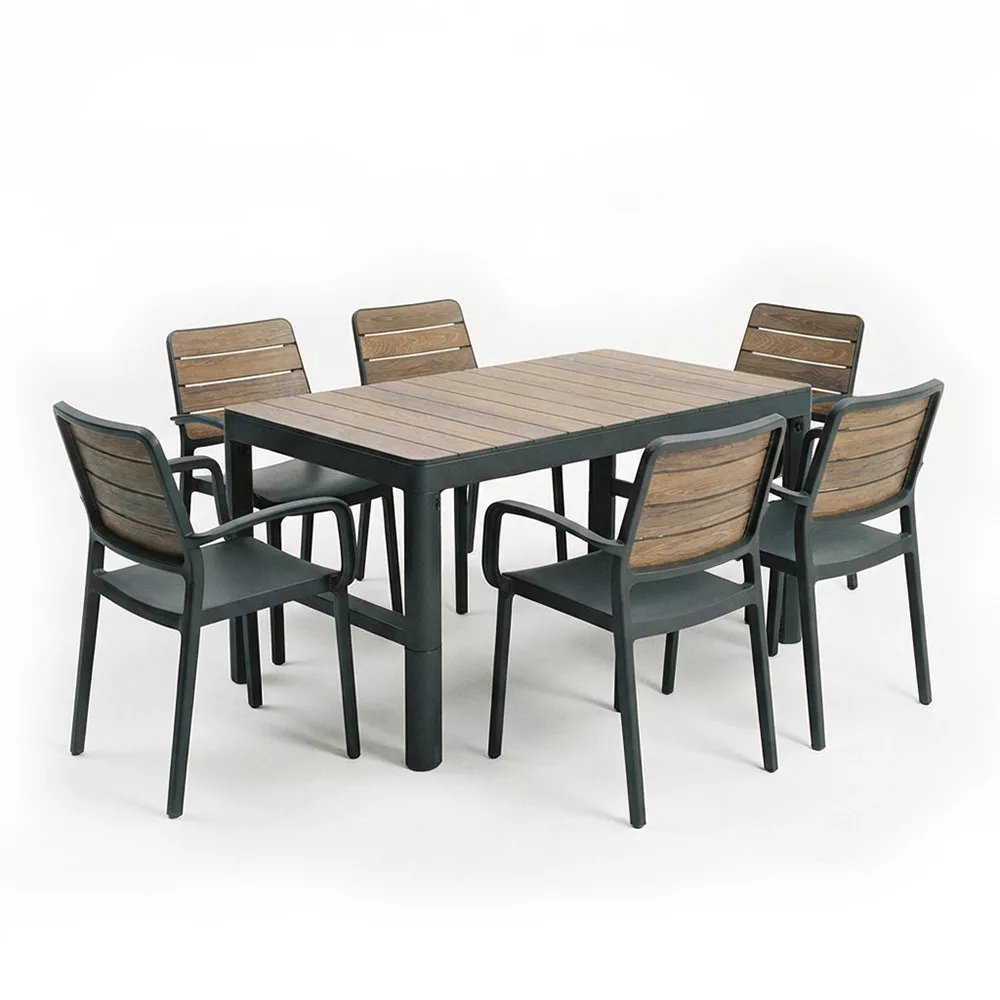 A DecoCoat technológiának köszönhetően az asztal természetes fa hatású felületet kapott, amely elegáns megjelenést biztosít a kertben vagy a teraszon. A felület ellenáll a karcolásoknak és a mindennapi használatból eredő igénybevételnek.