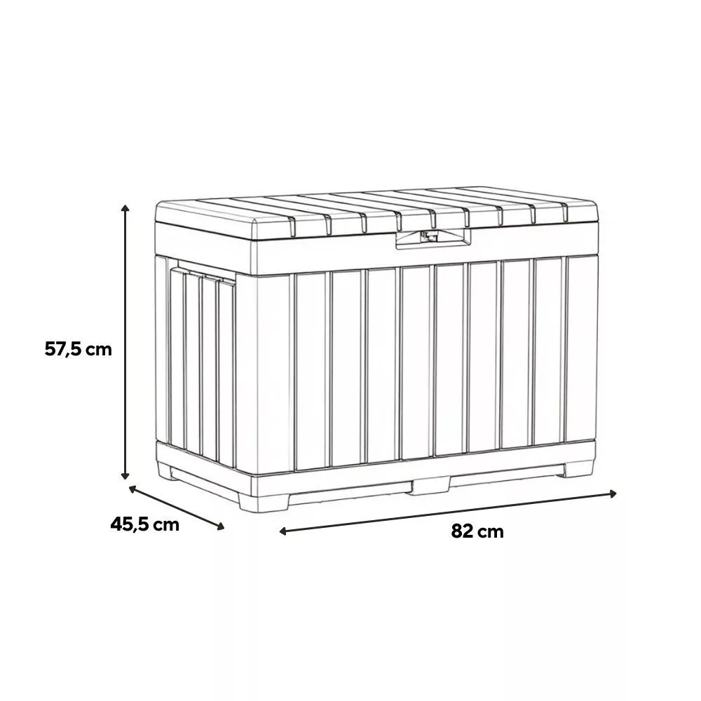 A természetes hatású kőrisfa mintázat és a sötét keretezés modern, mégis barátságos megjelenést ad a tárolóládának. A kialakítás jól illeszkedik fa hatású kerti bútorokhoz és letisztult teraszberendezéshez is, így a tároló nemcsak praktikus, hanem a kültéri tér harmonikus része lehet.