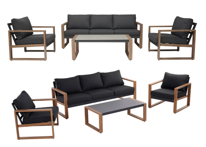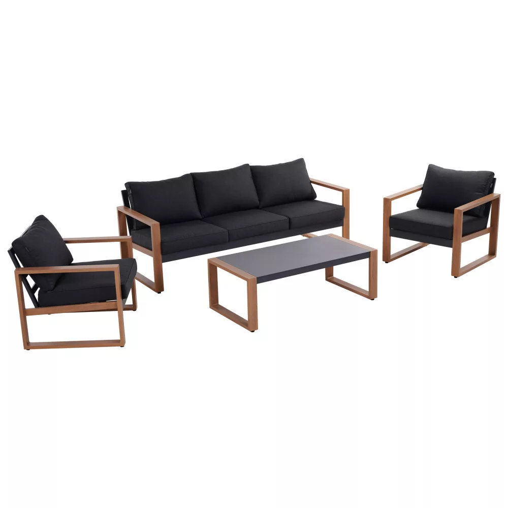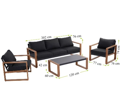 A bútorok stabilitását tömör alumínium váz biztosítja, melyet hosszú élettartam, korrózióállóság és időjárás ellenállóság jellemeznek. A készlet négy bútorból áll, egy kanapéból, melynek méretei (SzxMxM): 202x76x73,6 cm, két fotelből, amelyek méretei (SzxMéxMé): 77x76x73,6 cm és egy asztalból, amelyek méretei (SzxMéxM): 120x60x42 cm.