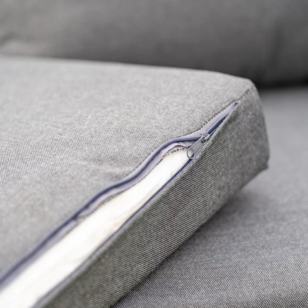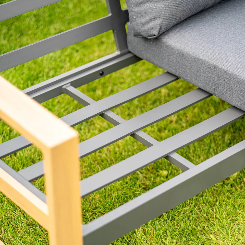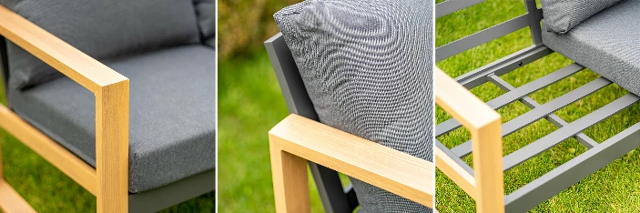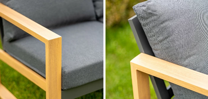 A bútor egyedi dizájnja megsokszorozza és specializálja a furnér utánzatot natúr kivitelű fa rajzzal, amely a bútor karfáján és lábain található. A tágas ülőfelületet sötétszürke poliészterből készült puha párnák egészítik ki a még nagyobb kényelem érdekében.