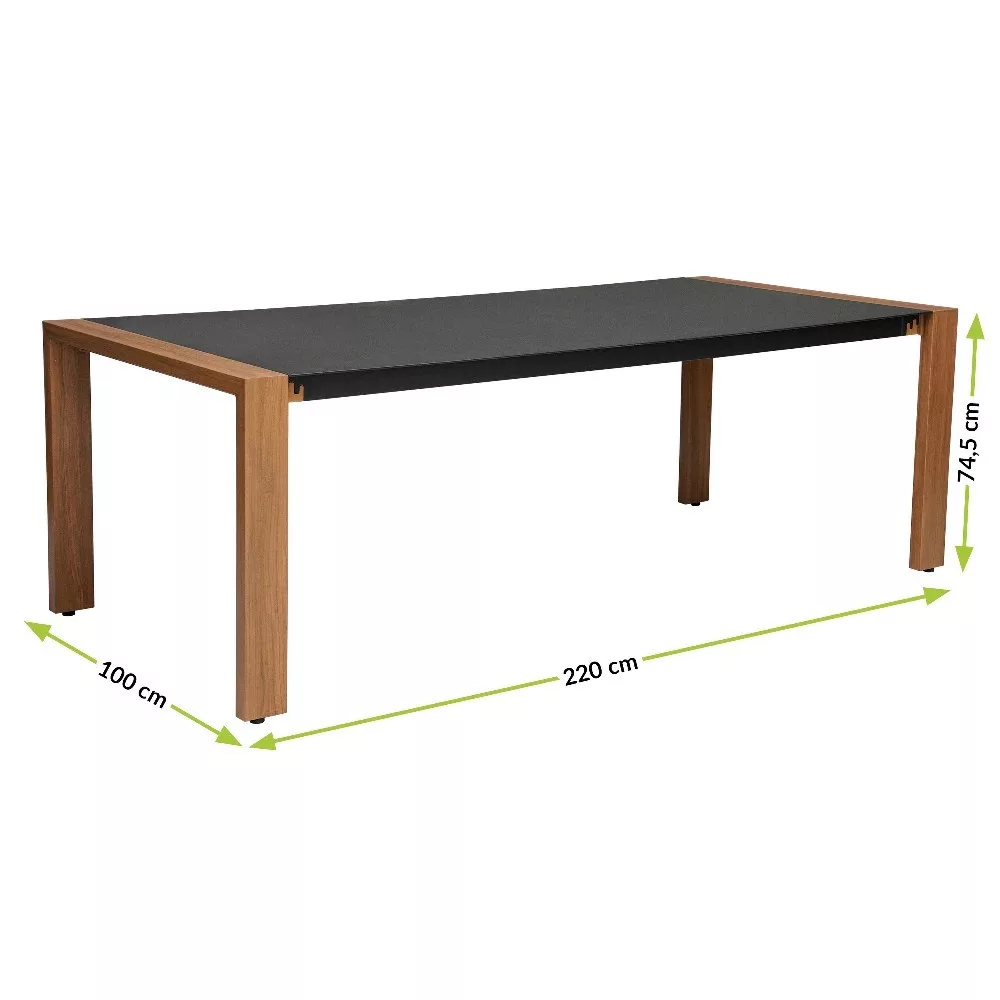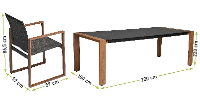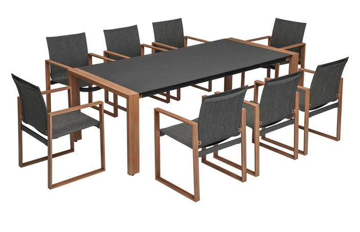 A készlet kilenc bútorból áll, nevezetesen 8 székből és egy asztalból. A szék méretei (SzxMéxM): 57x57,3x86,5 cm, maximális teherbírása 100 kg, az asztal méretei (SzxMxM): 220x100x74,5 cm. Az asztallap edzett üvegből készült, ami garantálja annak tartósságát és szilárdságát. A bútor egyedi dizájnja megsokszorozza és specializálja a furnér utánzatot natúr kivitelű fa rajzzal, amely a bútor karfáján és lábain található.