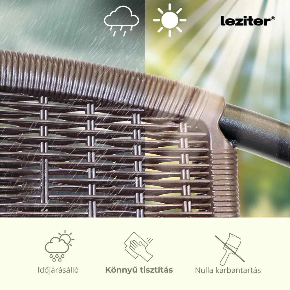 A modern kivitelű kerti bútorkészlet egy kerti üveglapos asztalt és 4 széket tartalmaz. A bútorokat 4 fő számára tervezték. A székek és az asztal lábazata fémből készül. Az asztallap 5 mm-es edzett üvegből készült, amely ellenáll a kisebb karcolásoknak. A műanyag szék ülésanyaga ellenáll az időjárási viszonyoknak. Előnye az ergonómikusan profilált ülés és karfa, amelyek tehermentesítik a vállakat pihenés közben.