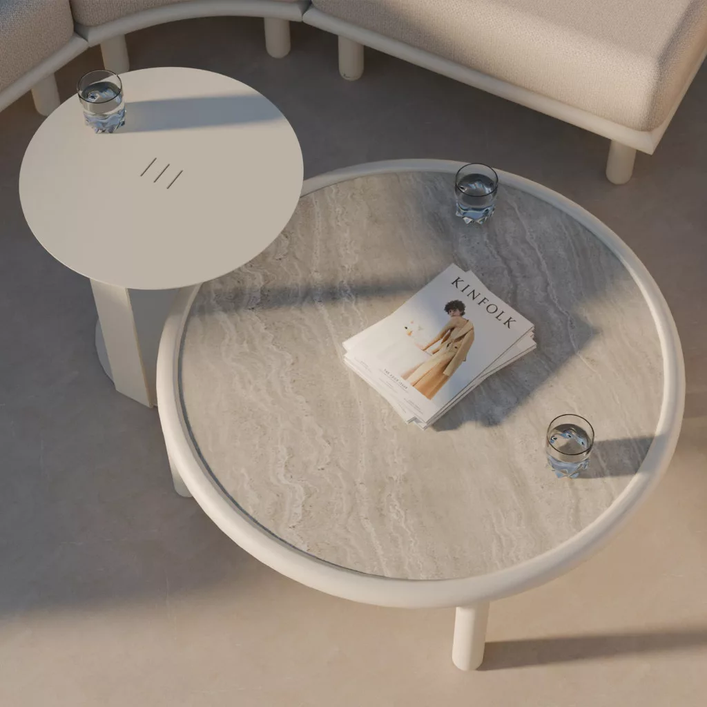 A szett központi eleme egy szinterezett kőből készült dohányzóasztal – egy olyan anyag, amely a könnyedséget kivételes tartóssággal ötvözi. A teteje nedvességálló, folt- és sérülésálló, és modern megjelenésű. A porszórt alumínium váz stabilitást és kényelmet biztosít, így az asztal ideális mind a mindennapi pihenéshez, mind a nagyobb összejövetelekhez.