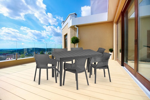 Az Evyon 6+1 kerti bútor garnitúra szett ideális minden környezetbe. Rendkívűl jó minőségű anyagokból készül, és minden részletre nagy figyelmet fordít , amelynek köszönhetően a legigényesebb ügyfelek elvárásainak is megfelel. Ez egy univerzális bútordarab, amely nemcsak a kertben vagy a teraszon, hanem az erkélyen is tökéletesen mutat. Az otthoni terek mellett éttermek udvarán, teraszán is használható. Annak a ténynek köszönhetően, hogy univerzális formájú és visszafogott, különféle elrendezésekbe egyaránt jól mutat.