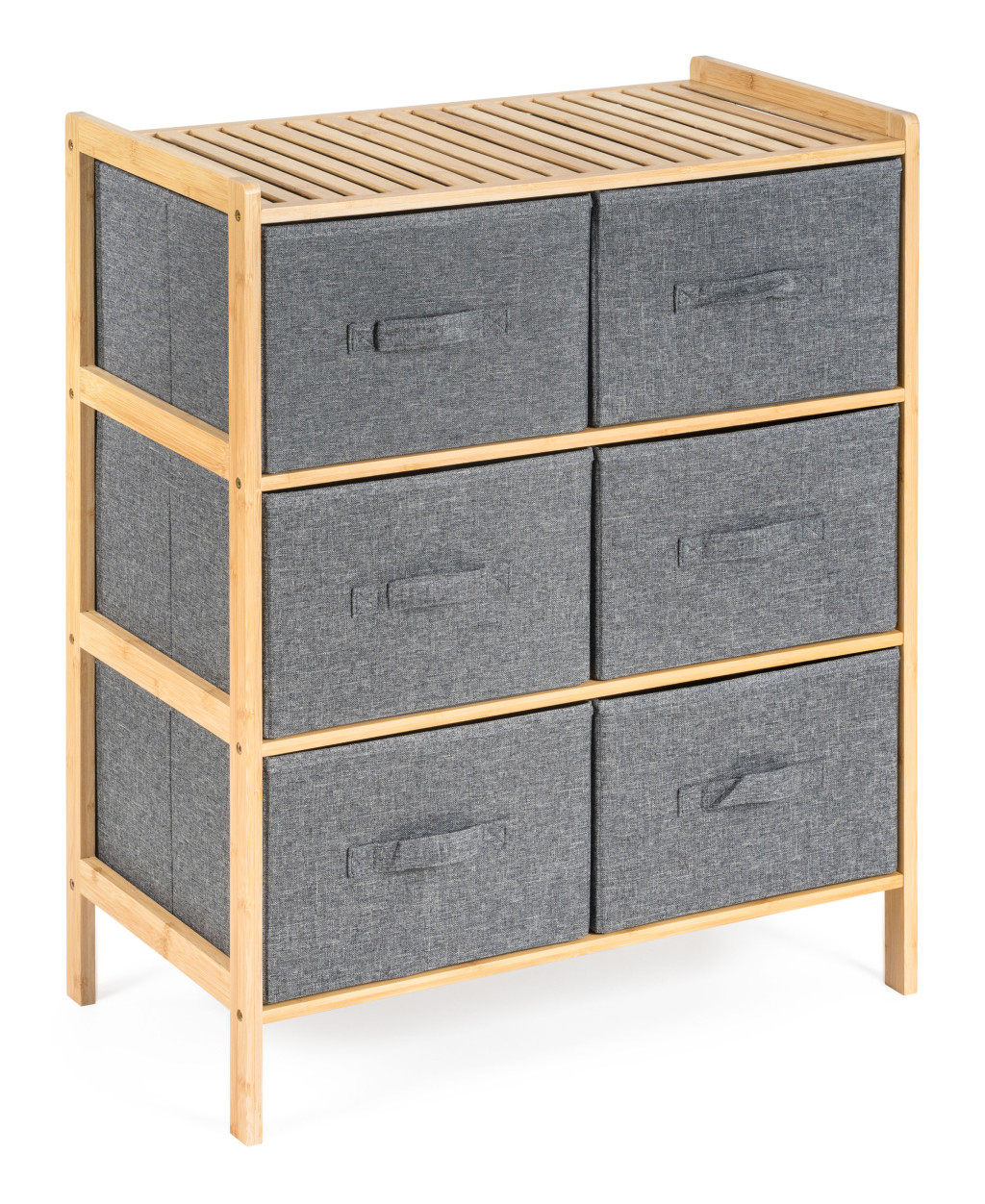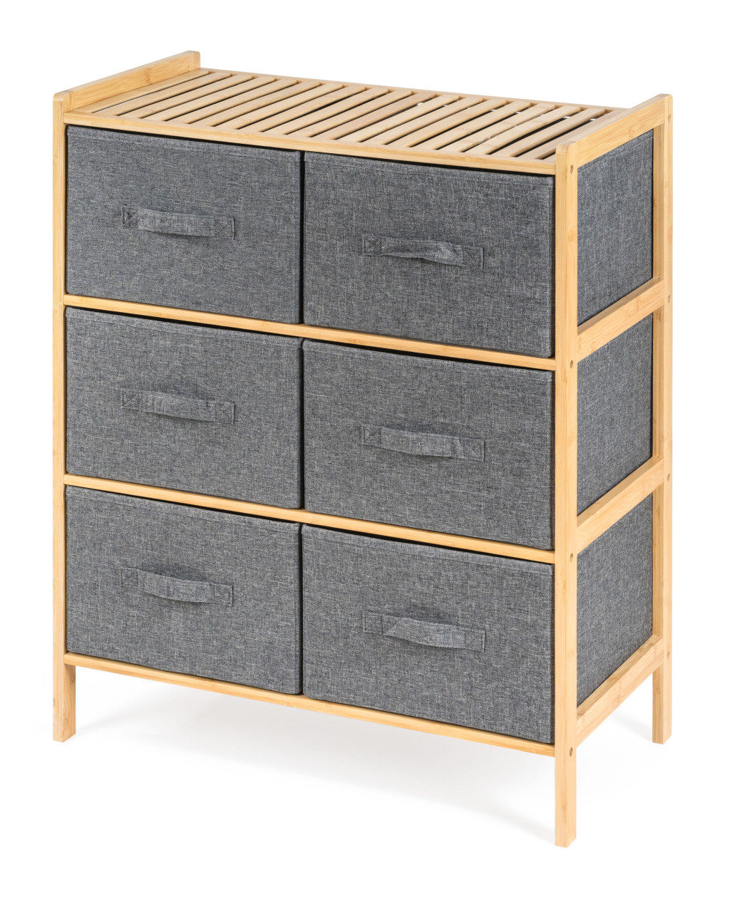 A praktikus állvány 6 kihúzható textilkosárral sok helyet takarít meg, és mindent tárolhat benne, amire szüksége van. Mosodai vagy kozmetikai cikkek, ruhák és gyermekjátékok. Mindegyik kosár térfogata 20 liter, szélessége 31 cm, magassága 19 cm és mélysége 35 cm. Az egész állvány mindössze 78,5 cm magas.