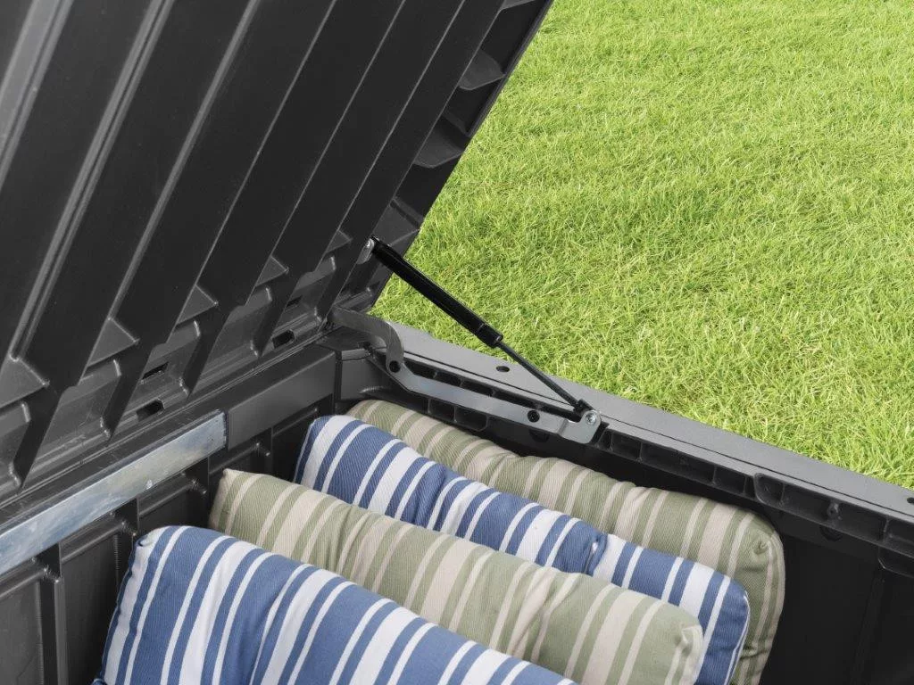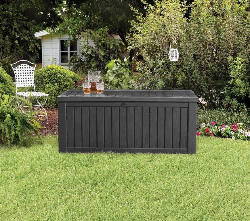 Modern grafit szín, 137 x 56 x 63 cm tároló hely, 570 l kapacitás, 220kg terhelhetőség, padló panel véd víztől, sártól, portól és más szennyeződéstől, bordaszegmensekkel erősítve. Polipropilén gyanta fa imitációval.