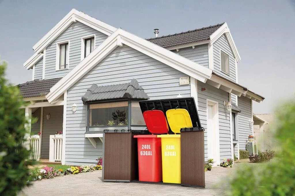 A dobozba szükség esetén polcokat is beszerelhet (nem tartozék). Ha nincs polc, egy fa deszkát is használhat, amelyet a csomagban található tartókhoz rögzíthet. A tárolóban két 240 literes kuka is elfér. Ha a kukákat a tárolóban tartja, felszerelheti a láncokat és kampókat, amelyek összekapcsolják a kukák fedelét a tároló felső részével, így egyszerűbbé téve a nyitást és zárást.