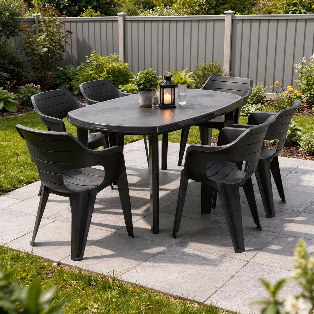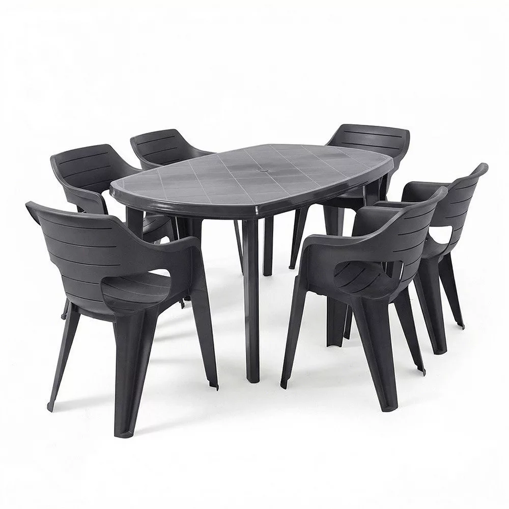 A Lino 6+1 kerti bútor garnitúra szett grafit színben kényelmes és praktikus választás családi étkezésekhez, teraszos vendéglátáshoz vagy hétvégi összejövetelekhez.