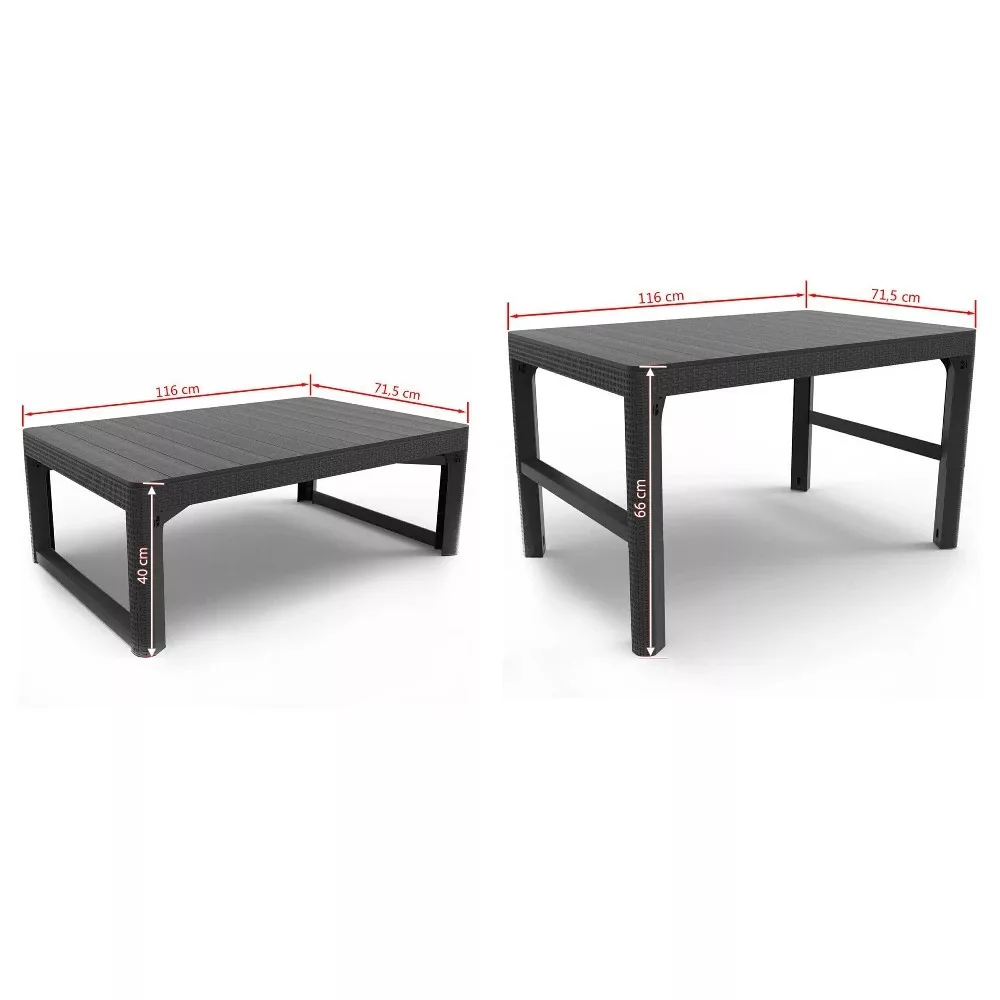 A Lyon asztal tartós műanyagból készül. A Lyon emelt kerti asztal kiváló választá vonzó áron. Polipropilénből készült és kompatibilis minden korfu bútorral , amely vizuális megjelenésével utánozza a technorattant. A polipropilén olyan anyag, amely ellenáll a kedvezőtlen időjárási viszonyoknak, az UV sugárzásnak, a hőmérsékleti különbségeknek vagy a mechanikai károsodásoknak, így külső használatra alkalmas.