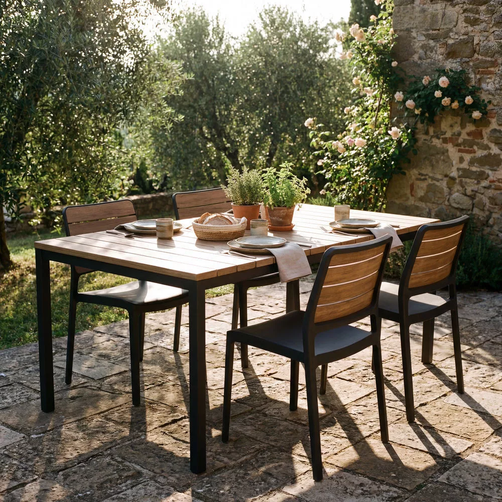 A Porto Nova 160 kerti asztal elegáns és letisztult megjelenésével ideális választás teraszokra, erkélyekre vagy kertekbe. A természetes hatású felület modern hangulatot teremt a kültéri terekben.