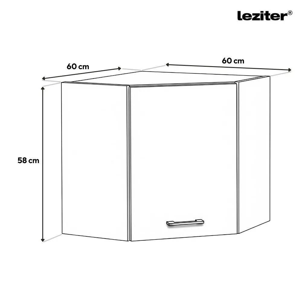 A Praktik 60 felső sarok szekrény 1 ajtós kivitelben a Praktik konyhabútor család részeleme, amely tökéletesen illeszkedik a Praktik 180 összeállításhoz. Sarok kialakításának köszönhetően ideális választás L alakú konyhákba, ahol fontos a hely maximális kihasználása, de akár önálló faliszekrényként is megállja a helyét.