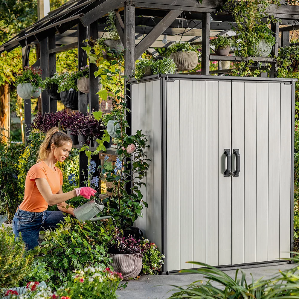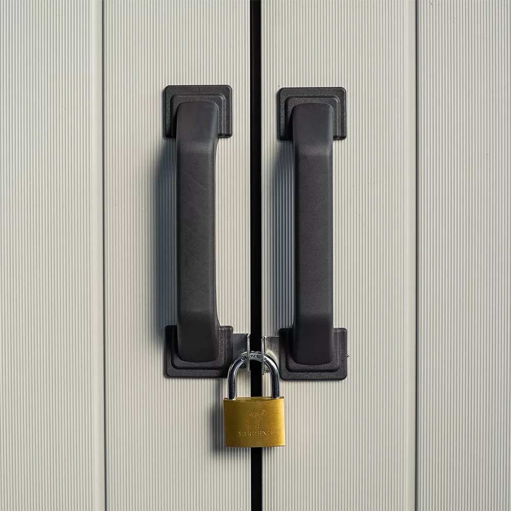 A Keter High Store kerti tároló dupla ajtaja reteszzárral rendelkezik. Elég, ha saját kezűleg vásárol egy lakatot, hogy megvédje a szekrényt a nemkívánatos felhasználóktól. A Kete High Store karbantartásmentes egész évben. A tisztításhoz vizet és enyhe tisztítószereket használhatsz.
