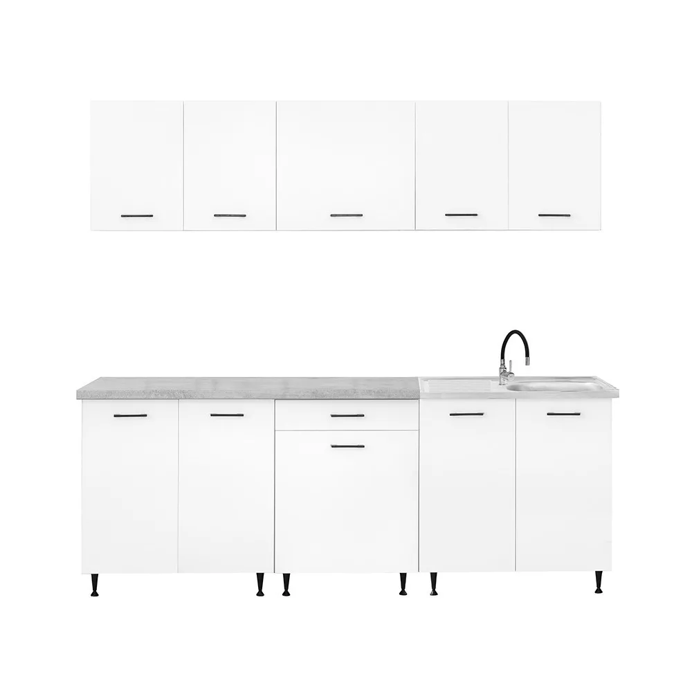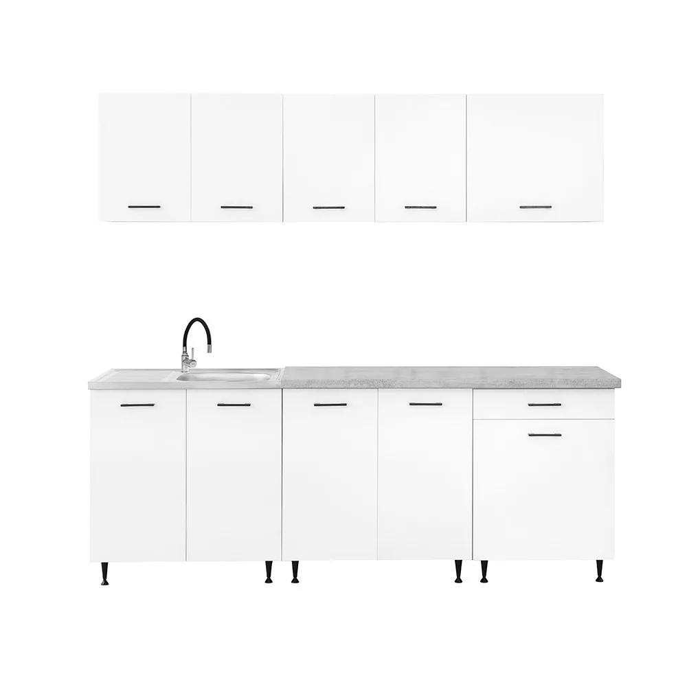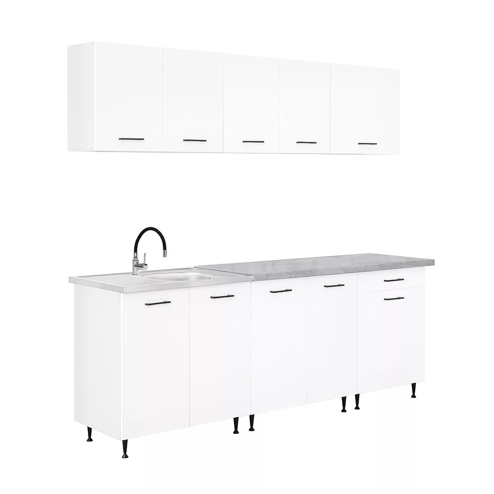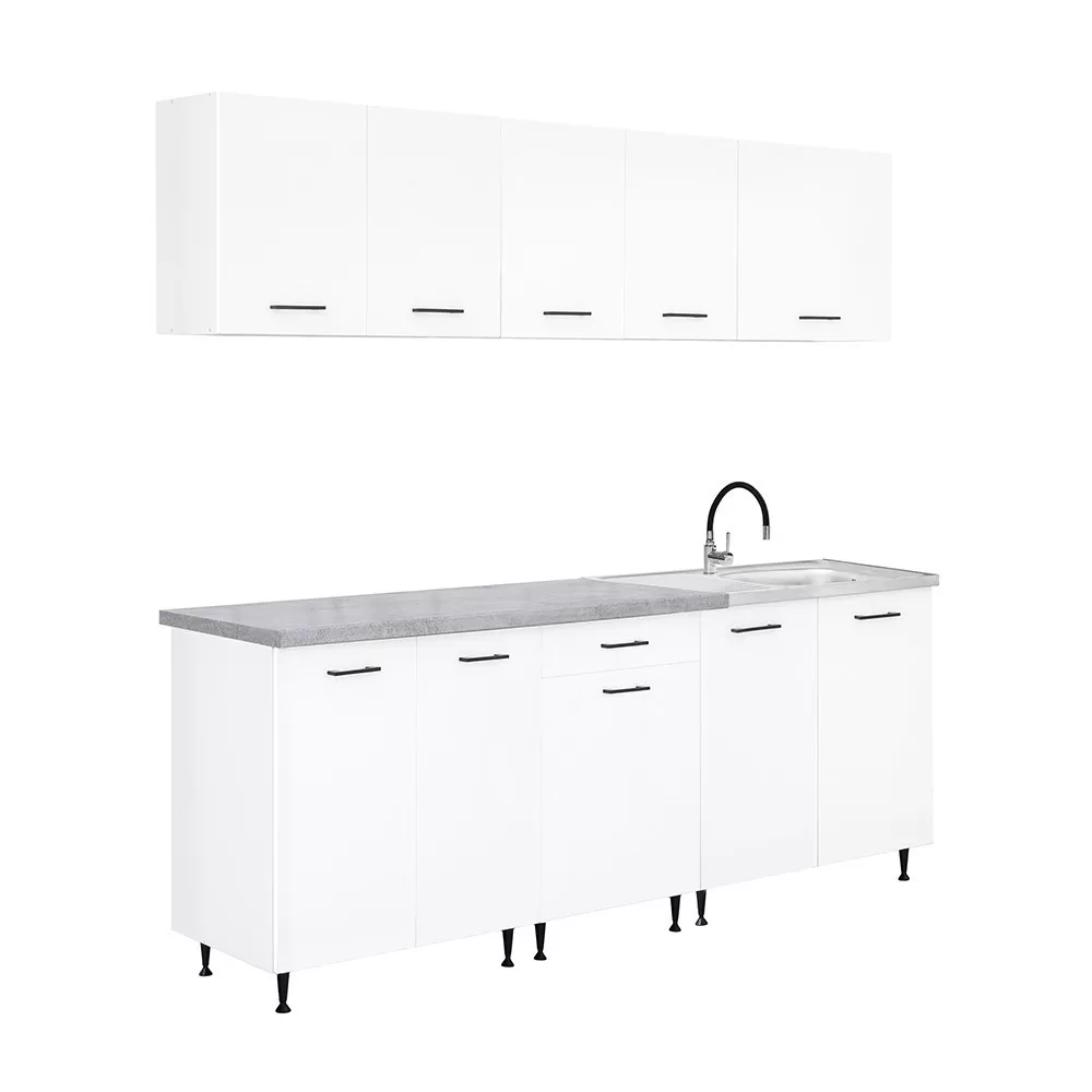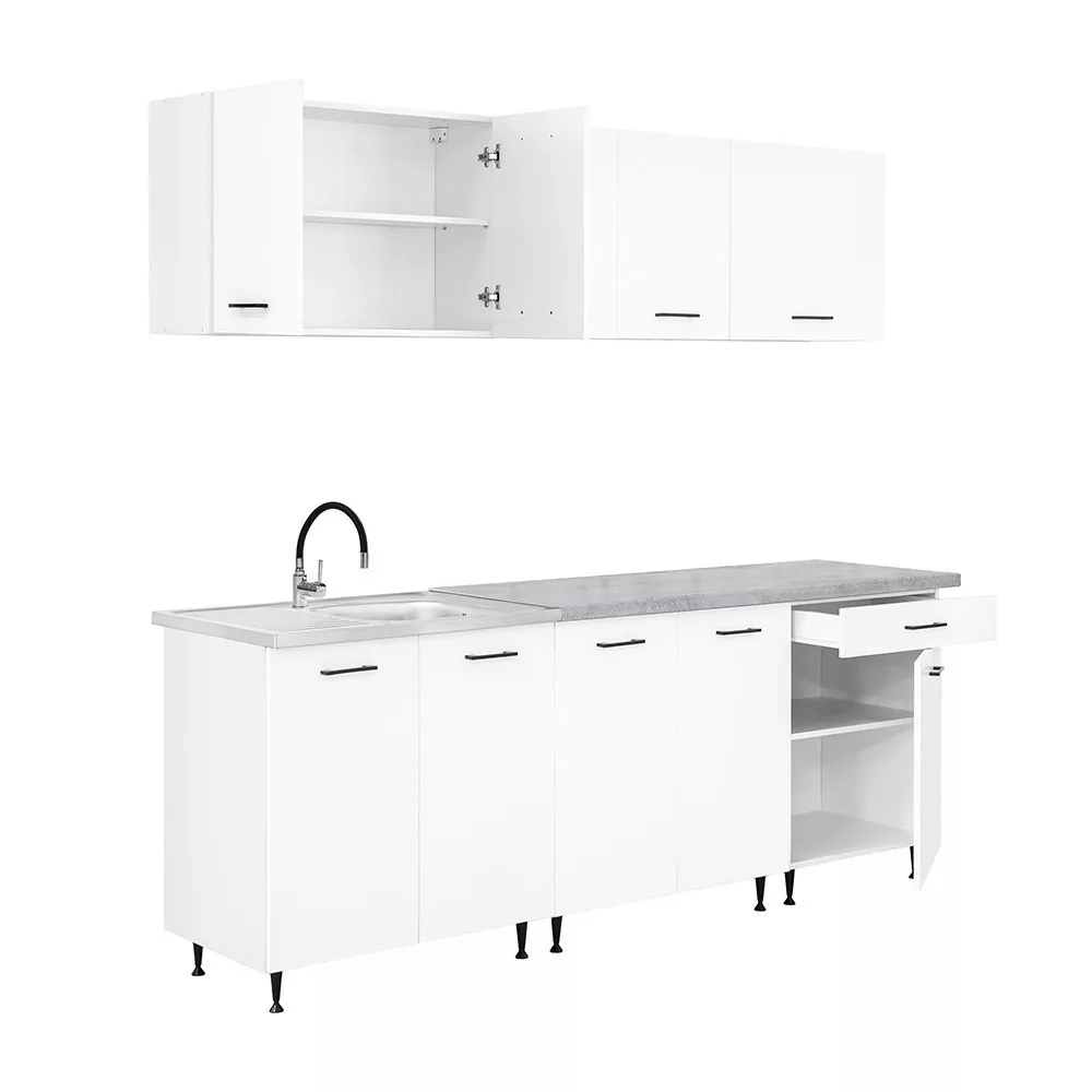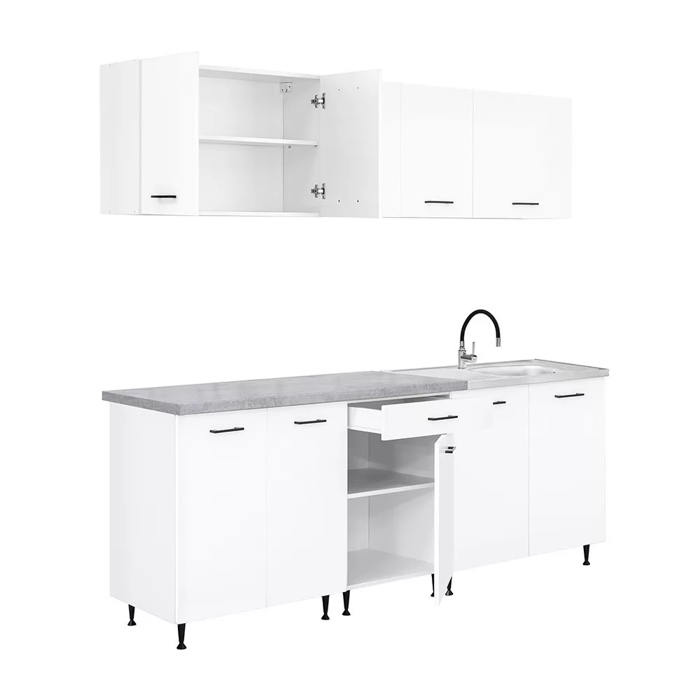 A 220 cm széles konyhabútor három felső és három alsó elemből áll, amelyek praktikus tárolóhelyet kínálnak a konyhai eszközök számára. A két 80 cm széles alsó szekrény alkalmas nagyobb edények vagy konyhai kellékek elhelyezésére, míg a 60 cm-es fiókos–ajtós elem jól használható evőeszközök és kisebb tartozékok rendszerezésére.