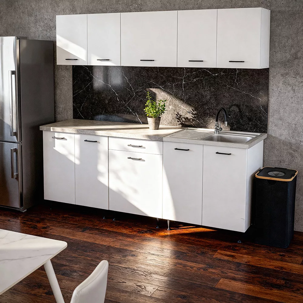A Leziter Primo 220 konyhabútor fehér korpusszal és Chromix tölgy munkalappal könnyen illeszkedik a modern otthonok világos, letisztult enteriőrjébe. Harmonikus színvilága friss, tágas hatást kelt, így ideális választás kisebb és közepes méretű konyhákhoz. Átgondolt elemkiosztása praktikus, jól szervezett mindennapi használatot kínál, miközben egységes, rendezett összképet biztosít.