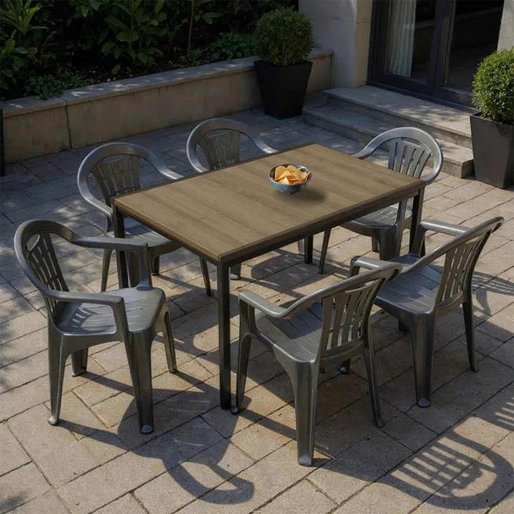 A prémium fröccsöntött polipropilén nem repedezik, nem rozsdásodik, nem fakul. A székeket kedvedre hagyhatod kint a perzselő napon vagy záporban – a Rowen garnitúra makulátlanul tűri a szélsőségeket. A Porto asztal DecoCoat™ fa-hatású felülete karc- és vízálló, a fekete acélváz pedig masszív stabilitást ad.