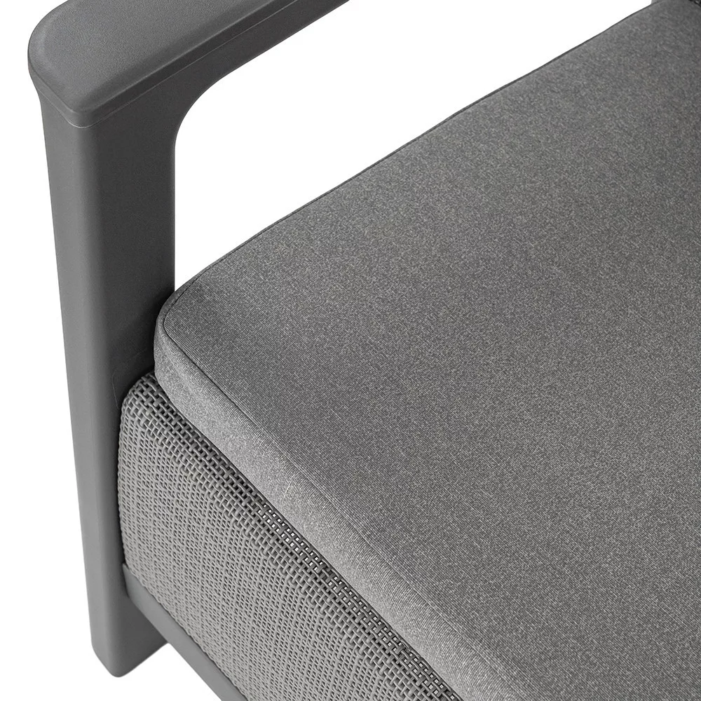 A szett kényelmes beszélgetősarkot alakít ki a kertben vagy a teraszon. Egységes, modern kültéri nappali hozható létre vele, miközben a tárolós asztal praktikus helyet biztosít a kiegészítőknek. Időjárásálló, gondozásmentes megoldás, amely rendezetten és átgondoltan formálja a kültéri teret.