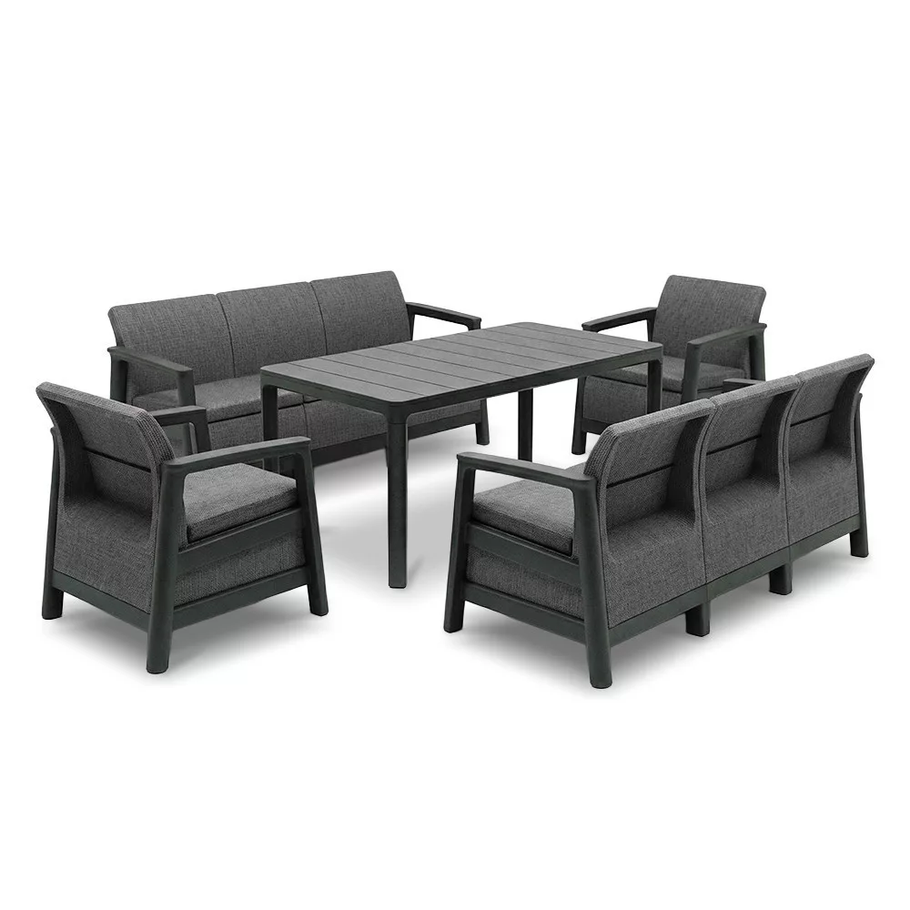 Ideális választás azok számára, akik grafit-hűvösszürke kerti bútor szettet keresnek, időjárásálló műanyag kültéri bútort szeretnének, kertbe, teraszra vagy erkélyre. Stabil, modern és hosszú távon is kényelmes kültéri ülőgarnitúra.