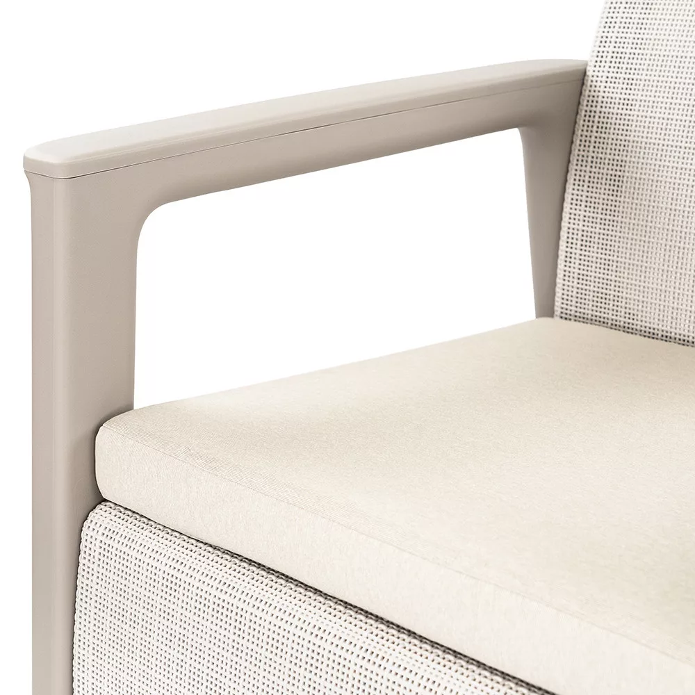 A szett kényelmes beszélgetősarkot alakít ki a kertben vagy a teraszon. Egységes, modern kültéri nappali hozható létre vele, miközben a tárolós asztal praktikus helyet biztosít a kiegészítőknek. Időjárásálló, gondozásmentes megoldás, amely rendezetten és átgondoltan formálja a kültéri teret.
