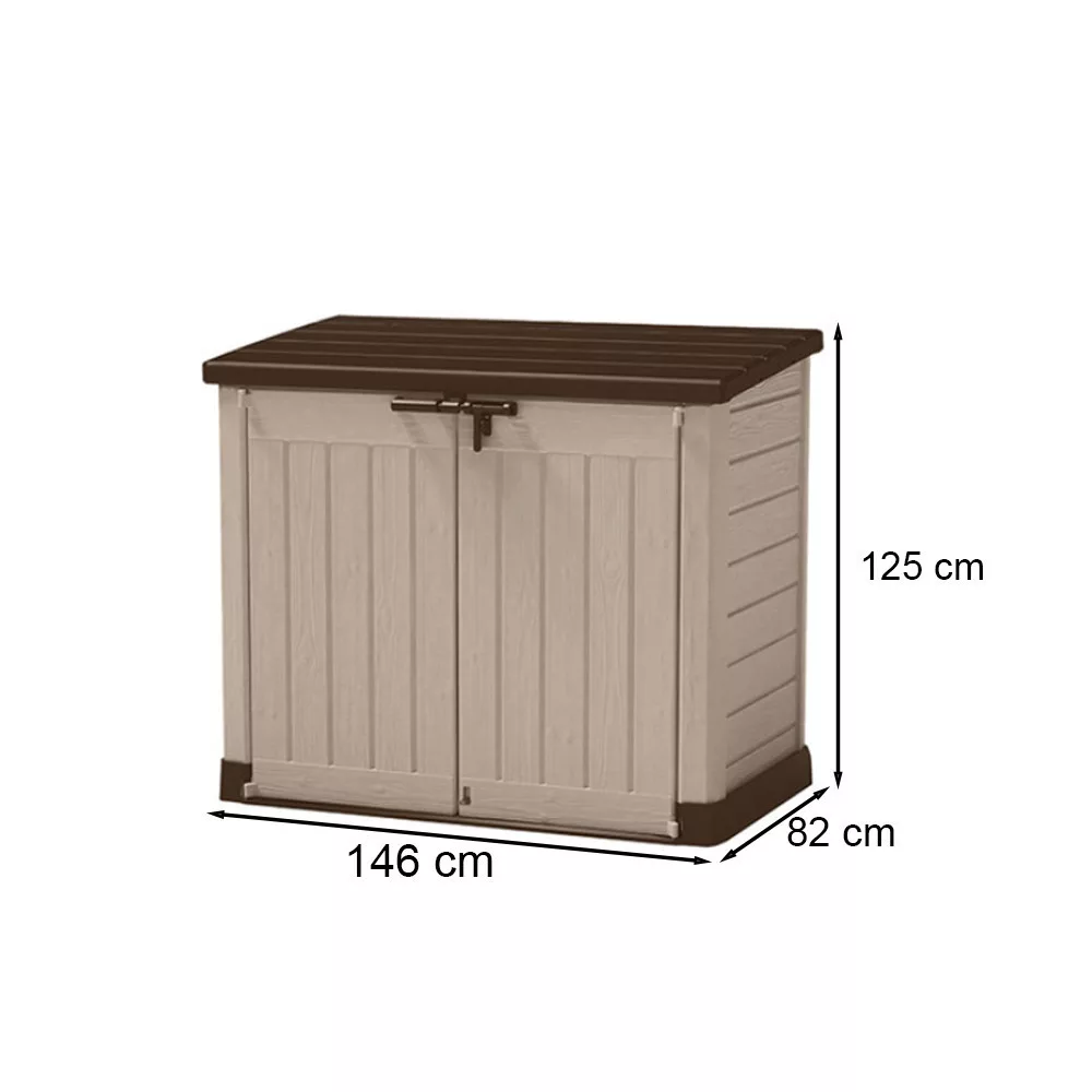 A Store in out max nagy méretű tárolótere ideális választás a kerti felszerelések, például a fűnyírók, kerti bútorok vagy sporteszközök tárolására. A belső tér tágas kialakítása biztosítja, hogy minden kerti eszköznek meg legyen a helye.