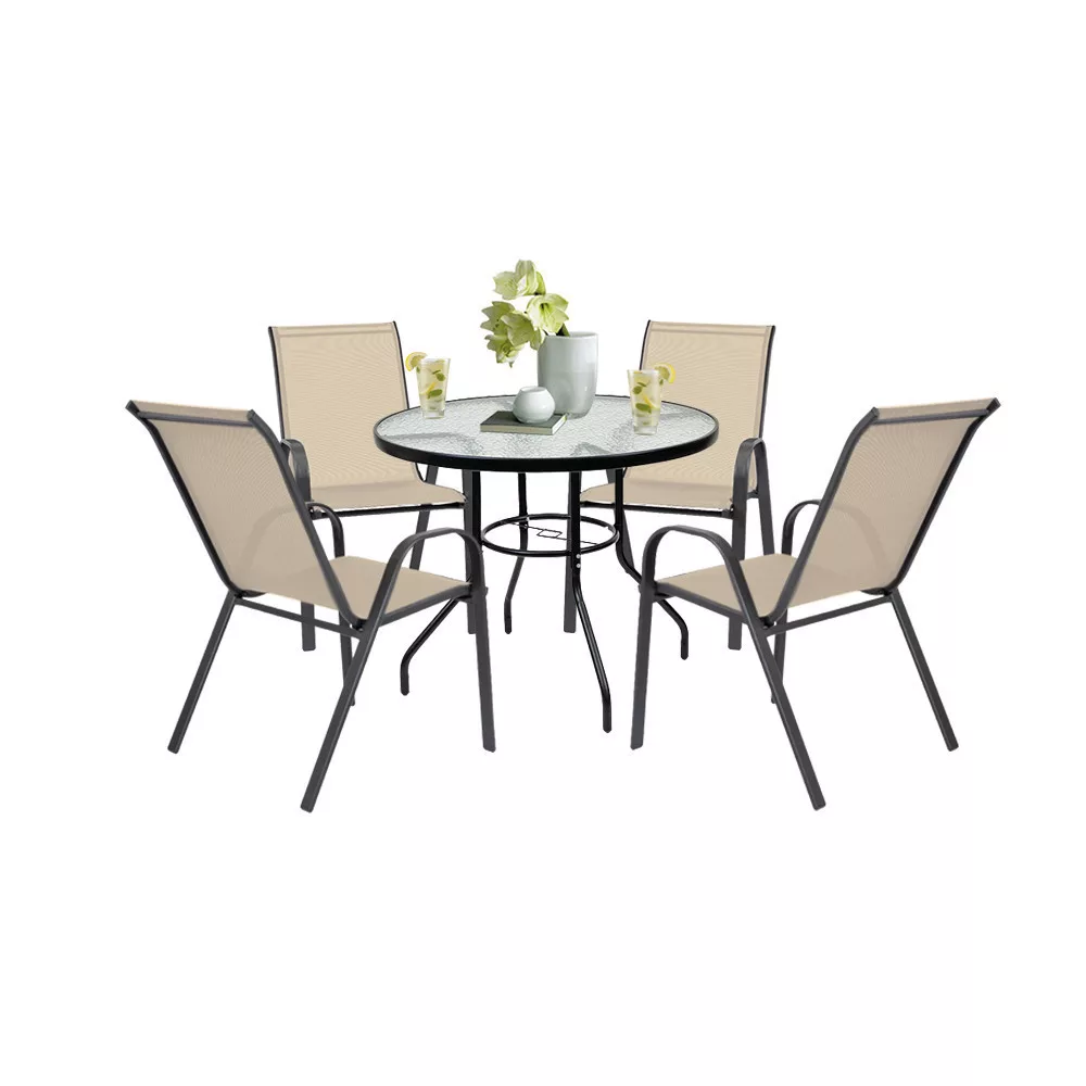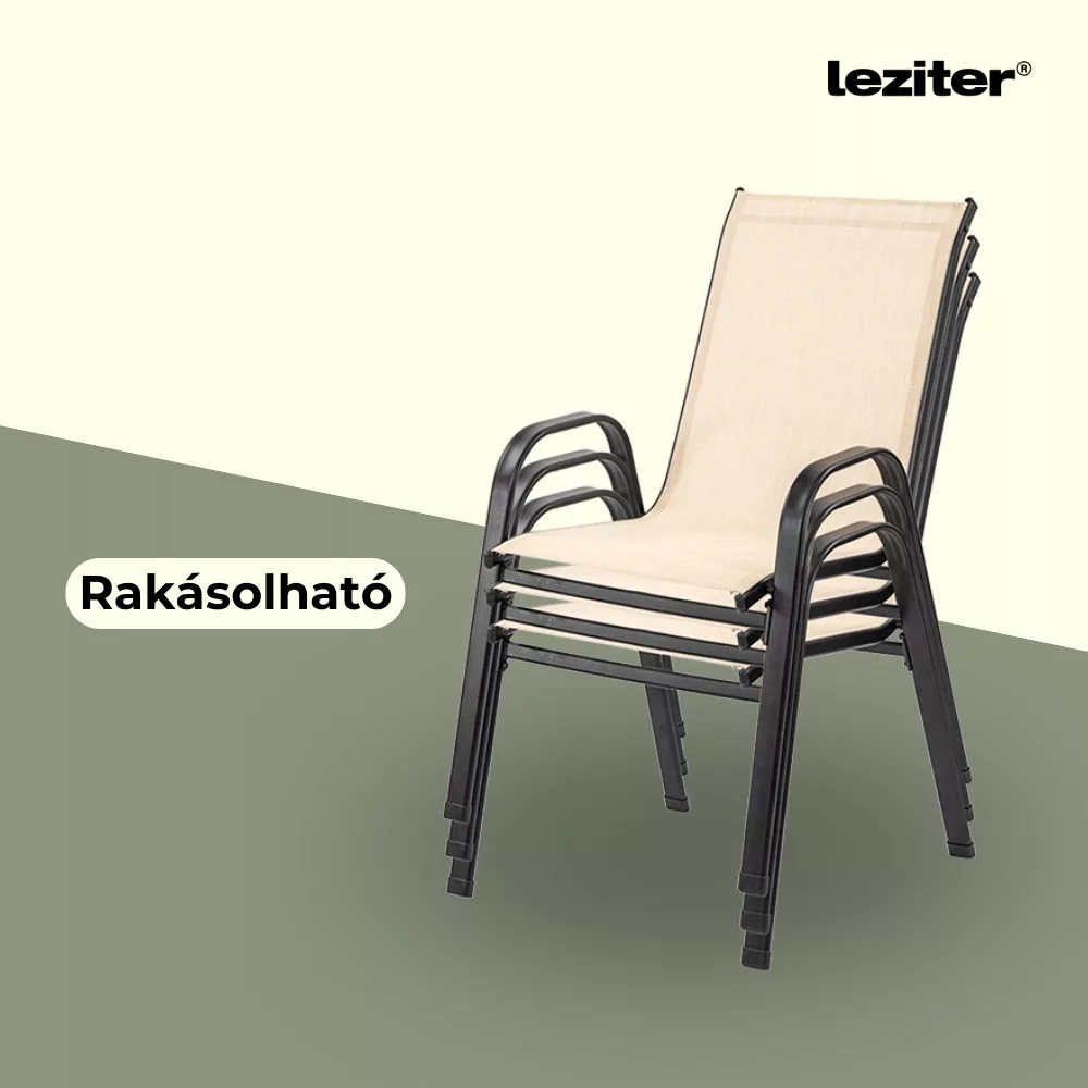 A modern kivitelű kerti bútorkészlet egy kerti üveglapos asztalt és 4 széket tartalmaz, a székek teherbírása maximum 120 kg. A bútorokat 4 fő számára tervezték. A székek és az asztal lábazata acélból készül. Az asztallap 5 mm-es edzett üvegből készült, amely ellenáll a kisebb karcolásoknak. Az textilén szék ülésanyaga ellenáll az időjárási viszonyoknak. Előnye az ergonómikusan profilált ülés és karfa, amelyek tehermentesítik a vállakat pihenés közben.