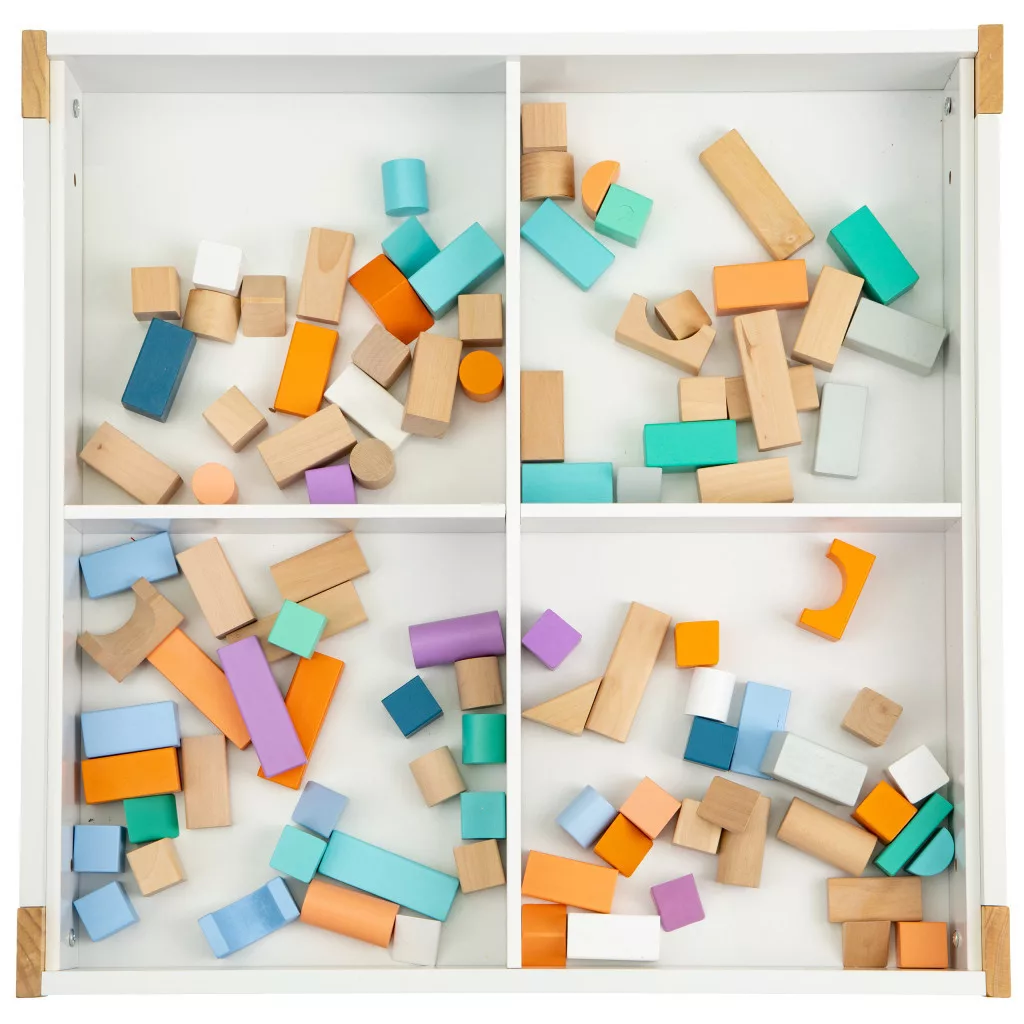 Az asztallap alatt egy szervező található, amely segít rendben tartani a dolgokat, és kialakítani a játék utáni rendrakás szokását. **4 tágas rekesz található benne, amelyekben építőkockák, játékok, rajzeszközök és akár könyvek is elférnek.**