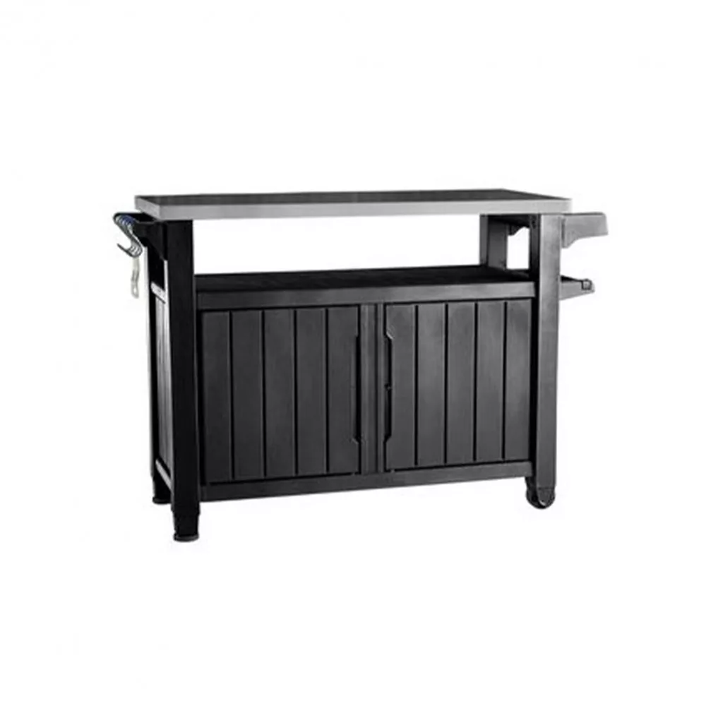 Ezenkívül a szekrény egyik oldalán horgok vannak a grillezőeszközök függesztéséhez, emellett egy praktikus papírtörölközőtartó van felszerelve. A szekrény kerekekkel van ellátva a könnyebb szállítás érdekében. A szekrény úgy néz ki, mint egy fából készült bútordarab, de valójában ez egy nagyon tartós műanyag. Ezt a szekrényt nem kell karbantartani, mivel a felhasznált anyag, a fától eltérően, tökéletesen tolerálja a kedvezőtlen időjárási viszonyokat. Nem kell lefednie, mert nem károsítja az esőre vagy a nap.