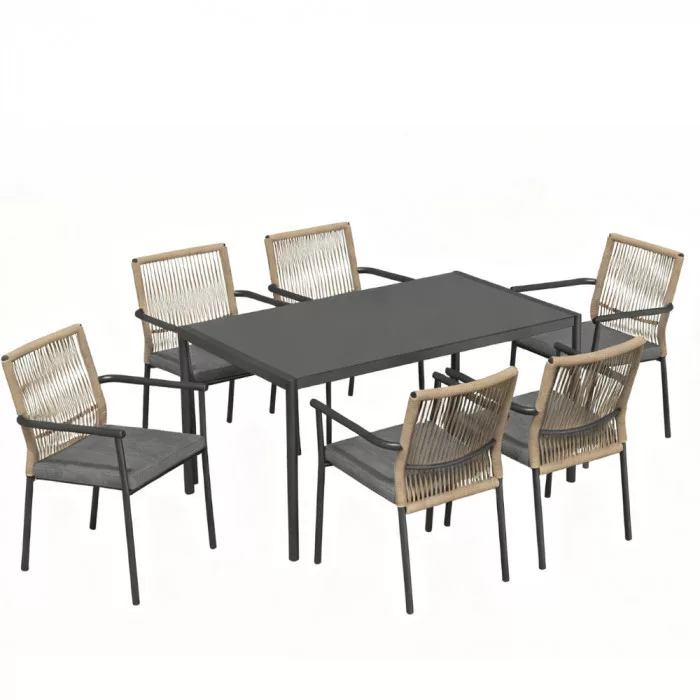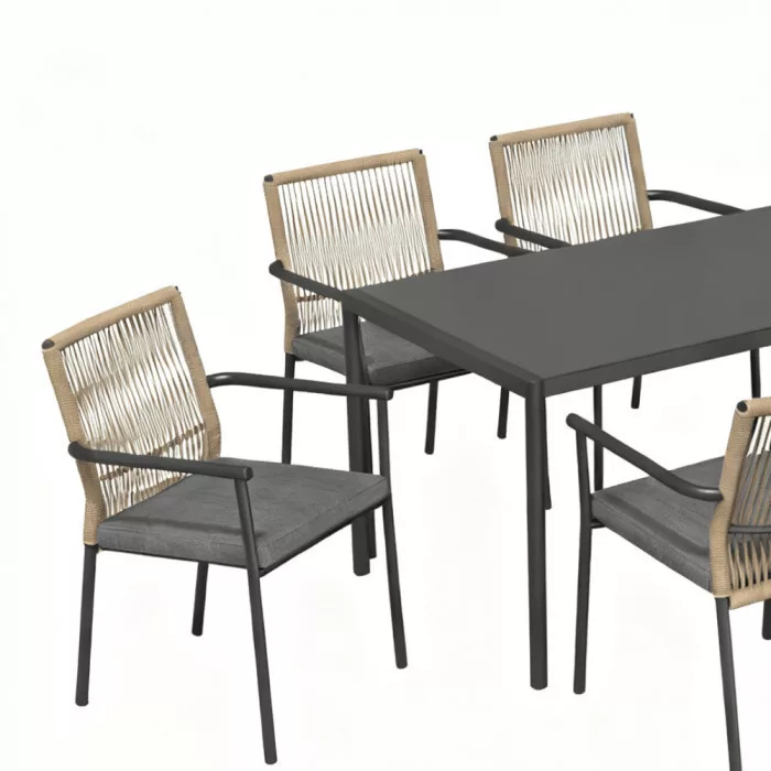 A VENCE étkezőgarnitúra egy asztalból és hat karfás székből áll, melyeket kertekben, teraszokon és étkezőudvarokban való használatra terveztek. Klasszikus formája és funkcionális elrendezése kényelmes használatot biztosít mind magán-, mind kereskedelmi terekben.