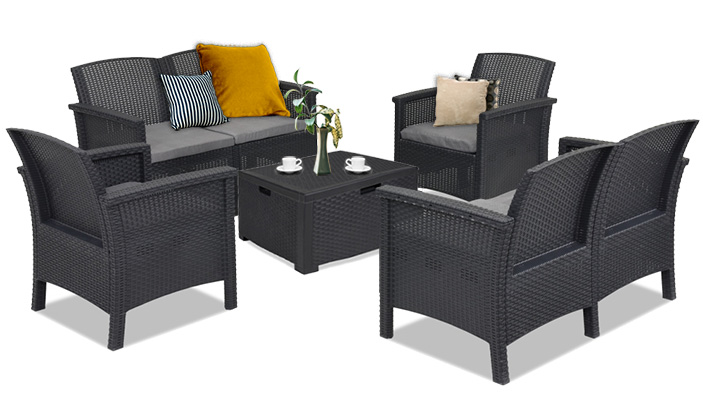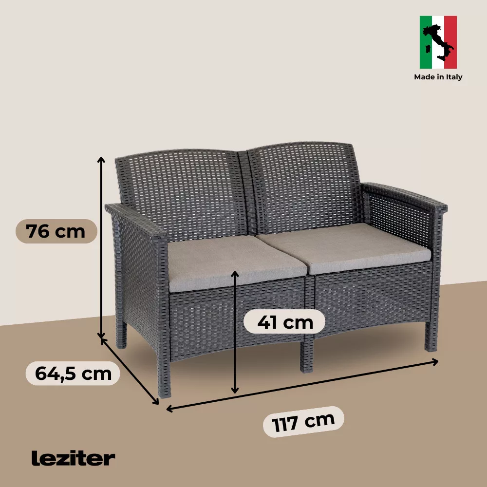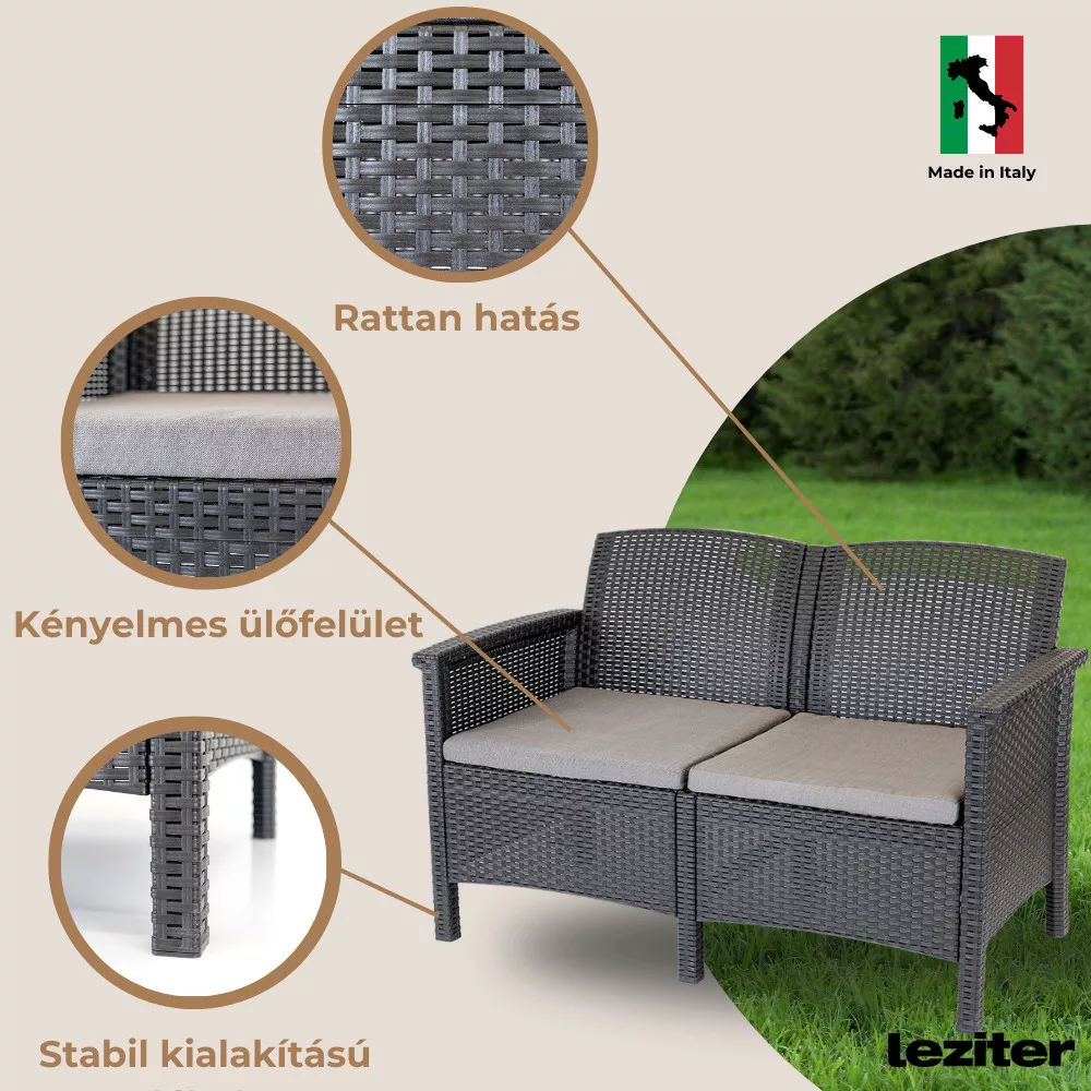 Ez az Olaszországban gyártott, grafit színű, kényelmes és elegáns bútor szett kettő 63 x 64,5 x 76 cm-es fotelt, kettő kétszemélyes 117 x 64,5 x 76 cm-es kanapét és egy négyszögletes 60 x 54,5 x 40,5 cm-es asztalt foglal magába. A Venus Big 6 személyes szett elegendő helyet biztosít az egész család, vagy a barátok számára, hogy a szabad levegőn tudják tölteni az időt, vagy egy kellemes vacsorát.