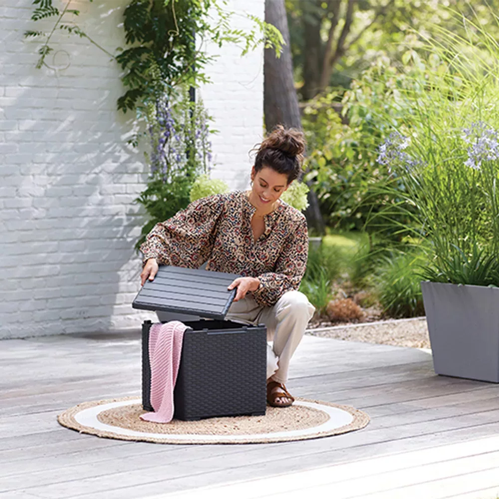 Az asztal teteje könnyedén felnyitható, így kiegészítő tárolóhelyet biztosít a kerti eszközöknek, párna- és takarótárolásra is ideális. A tető stabil felületet nyújt, amit asztalként is használhatsz, legyen szó italokról vagy kerti dekorációról.
