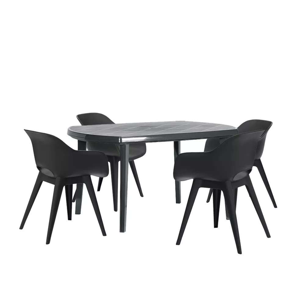 Ez a grafit színű, kényelmes és elegáns bútor szett négy darab 57X56X81 cm-es széket, és egy 137X90X73 cm-es asztalt foglal magában. Ez a 4 személyes kerti bútor szett rendkívül előnyös lehet, ha szeretnéd kiélvezni a szabadban eltöltött időt barátaiddal vagy családoddal. Ideális elemként szolgál a kert, erkély vagy terasz díszítéséhez. Különleges formája és minimalista megjelenése teszi univerzálissá és bármilyen elrendezéshez alkalmazkodik. A szett praktikus megoldás, egész évben a szabadban maradhat, hisz magas a tűröképessége és ellenáll a szélsőséges időjárásoknak.